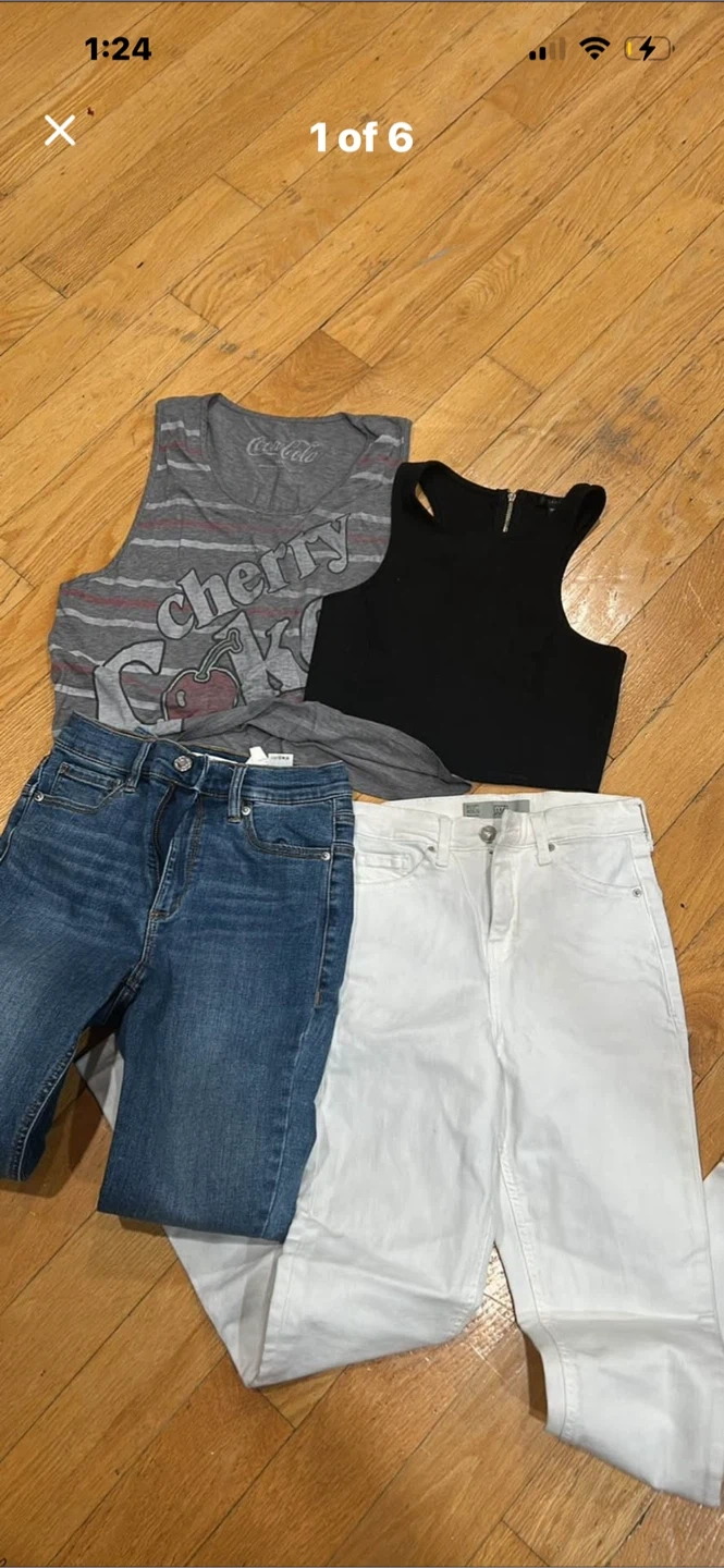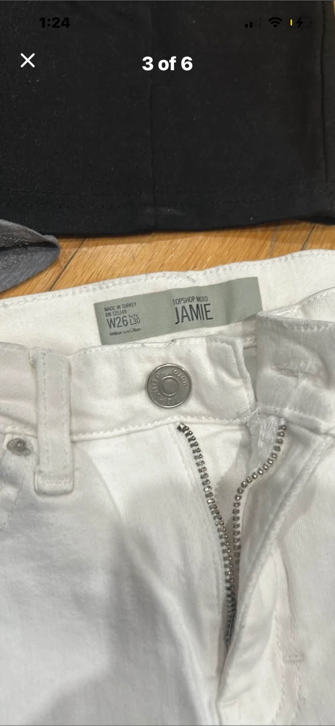Selling a clothing bundle with items from Topshop, Dynamite, and DYN DNM. Included are Topshop Moto Jamie white jeans in size W26 L30, a Dynamite black top in size TP/XS, and DYN DNM Kate jeans in size 26. All in great condition!