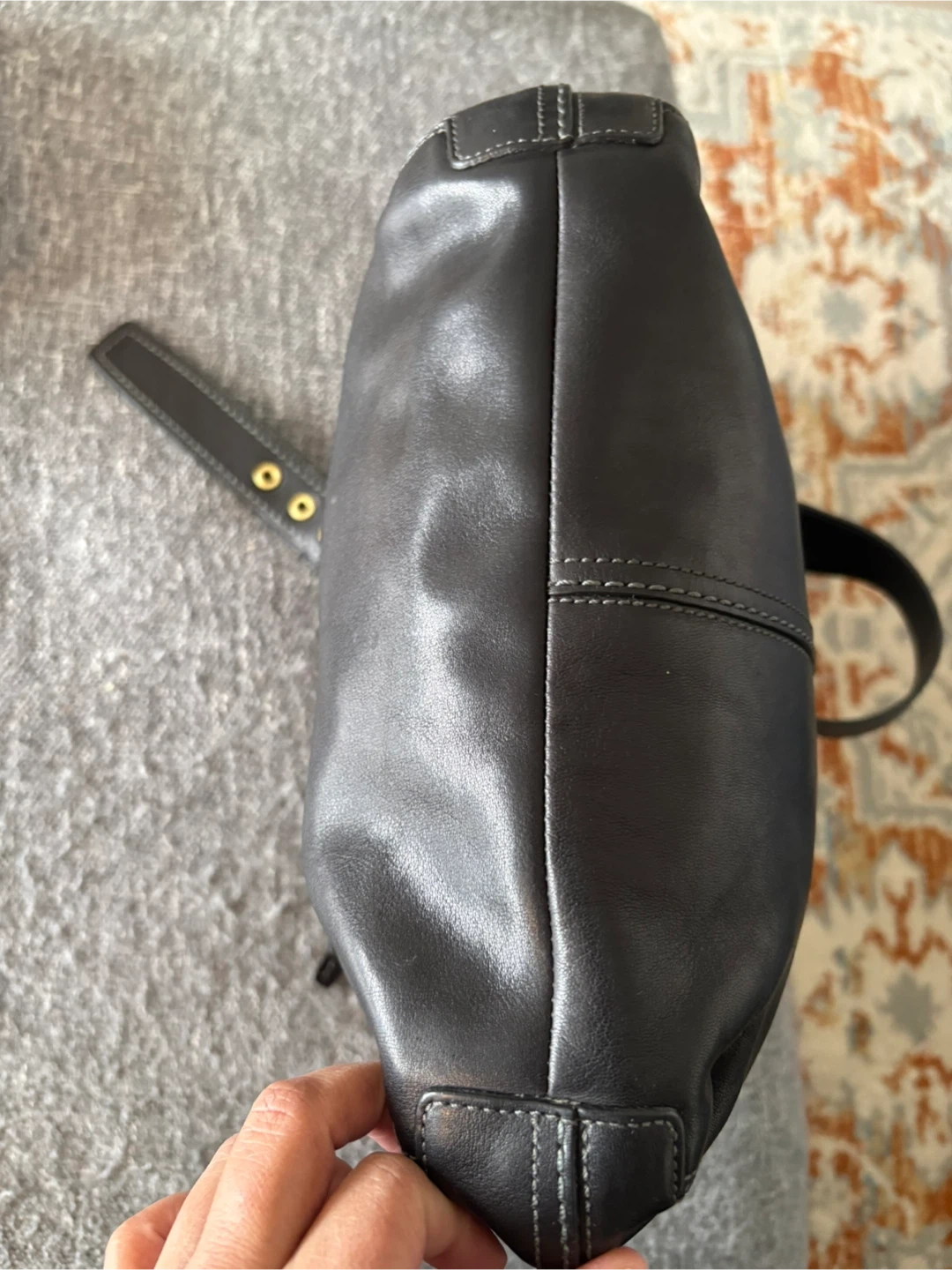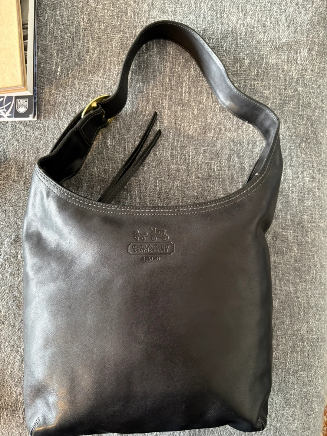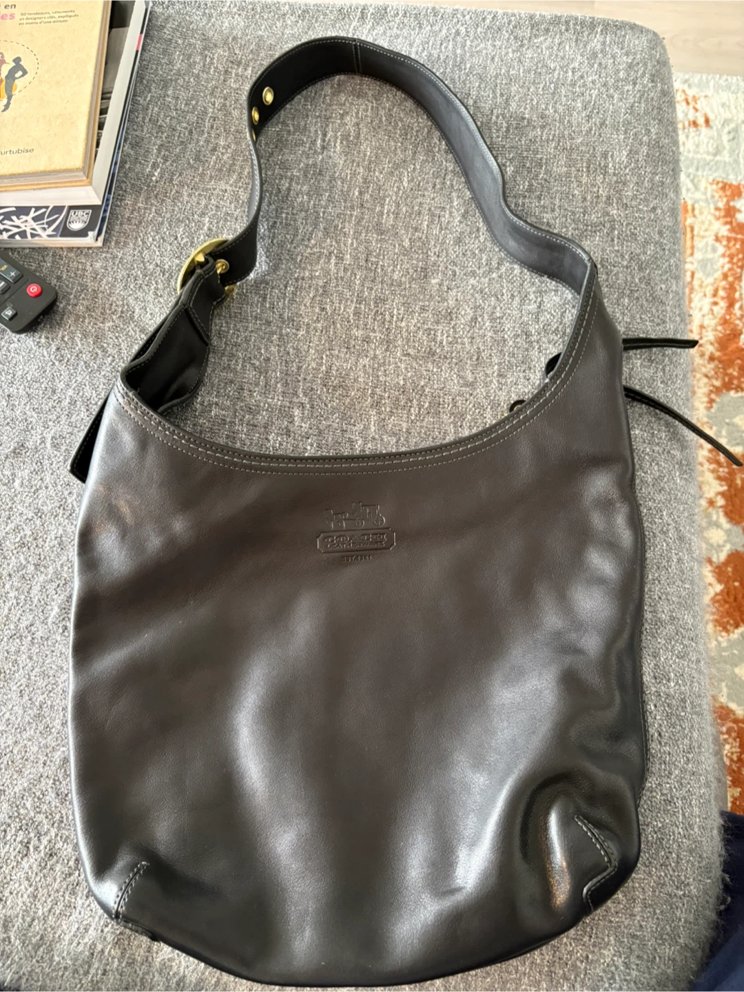 Coach Bleeker hobo bag in solid black leather and signature brassy gold hardware. It’s from the 2008 collection, I believe. In excellent condition and no wear and tear. The leather is smooth, durable and high quality.