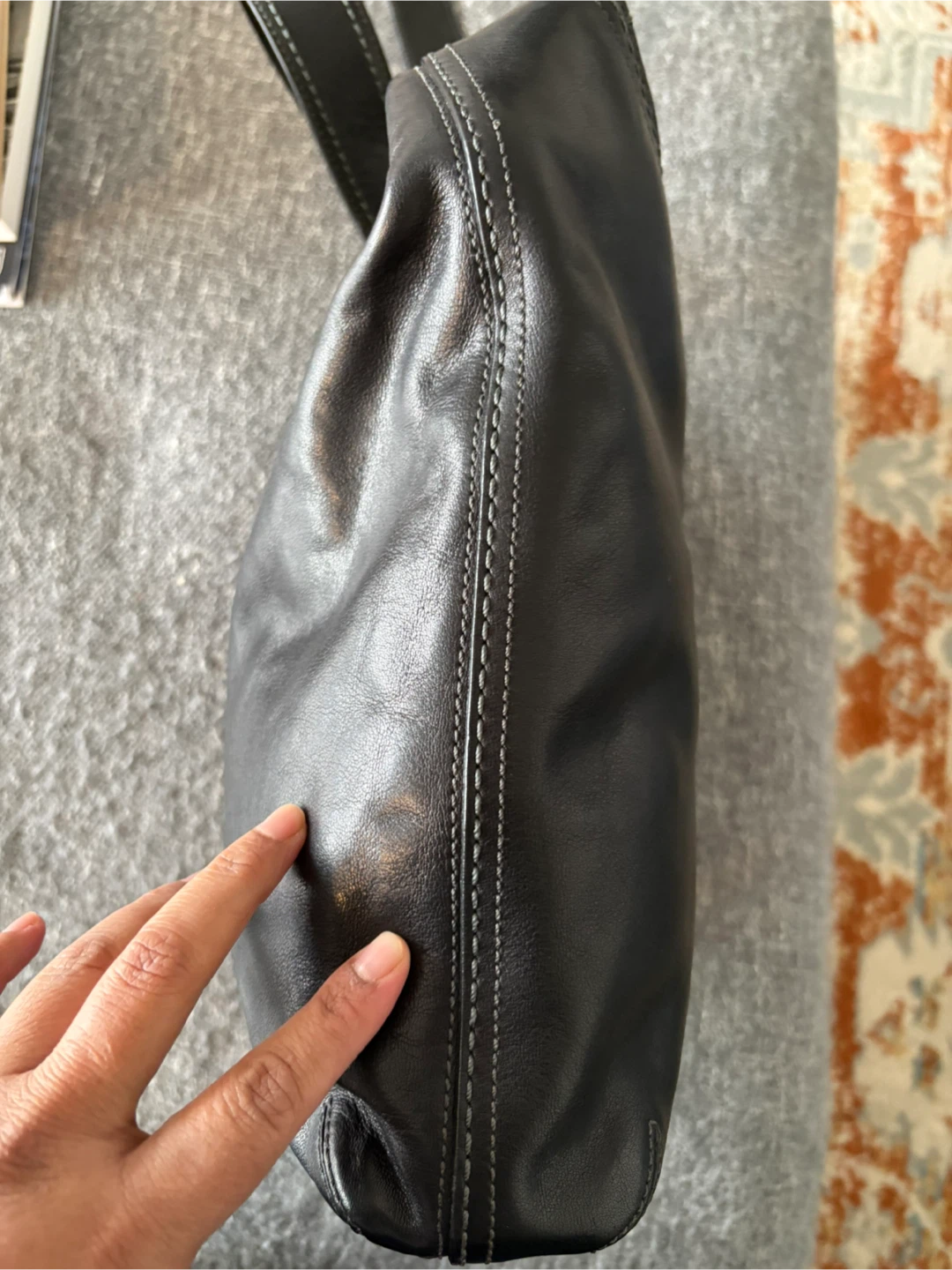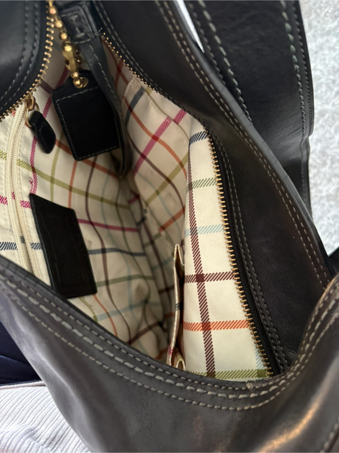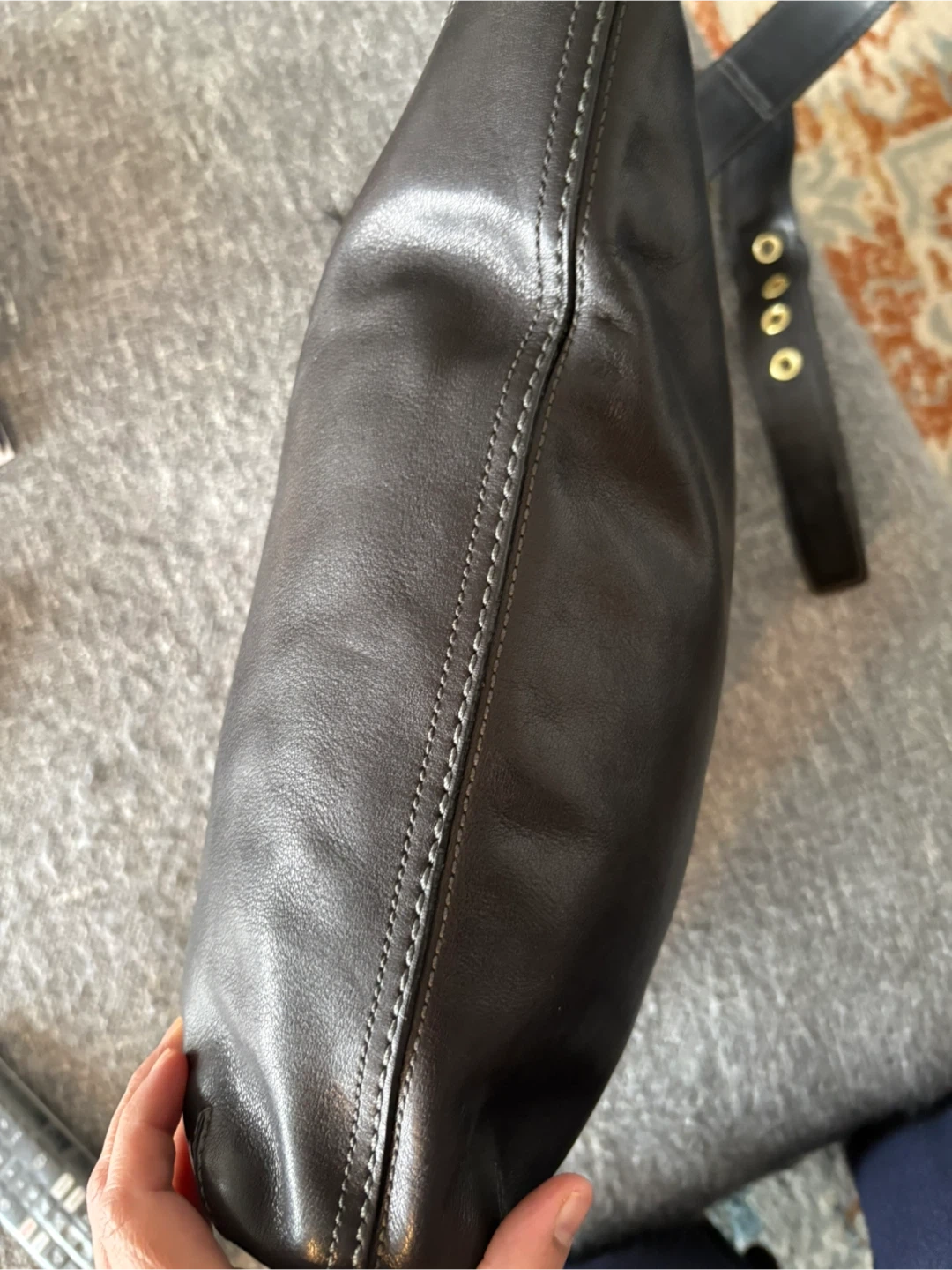 Coach Bleeker hobo bag in solid black leather and signature brassy gold hardware. It’s from the 2008 collection, I believe. In excellent condition and no wear and tear. The leather is smooth, durable and high quality.