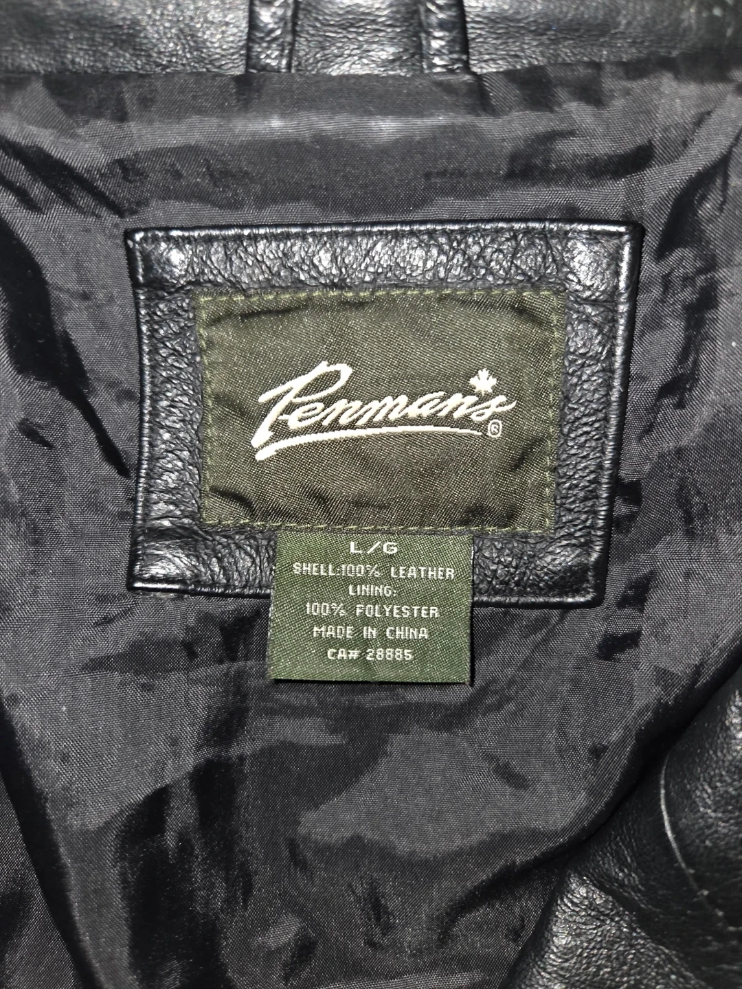 Here's a stylish black leather jacket from Penmans! It's a size L/G (Large). The shell is 100% leather, and the lining is 100% polyester. Made in China, this jacket is ready to add some edge to your wardrobe