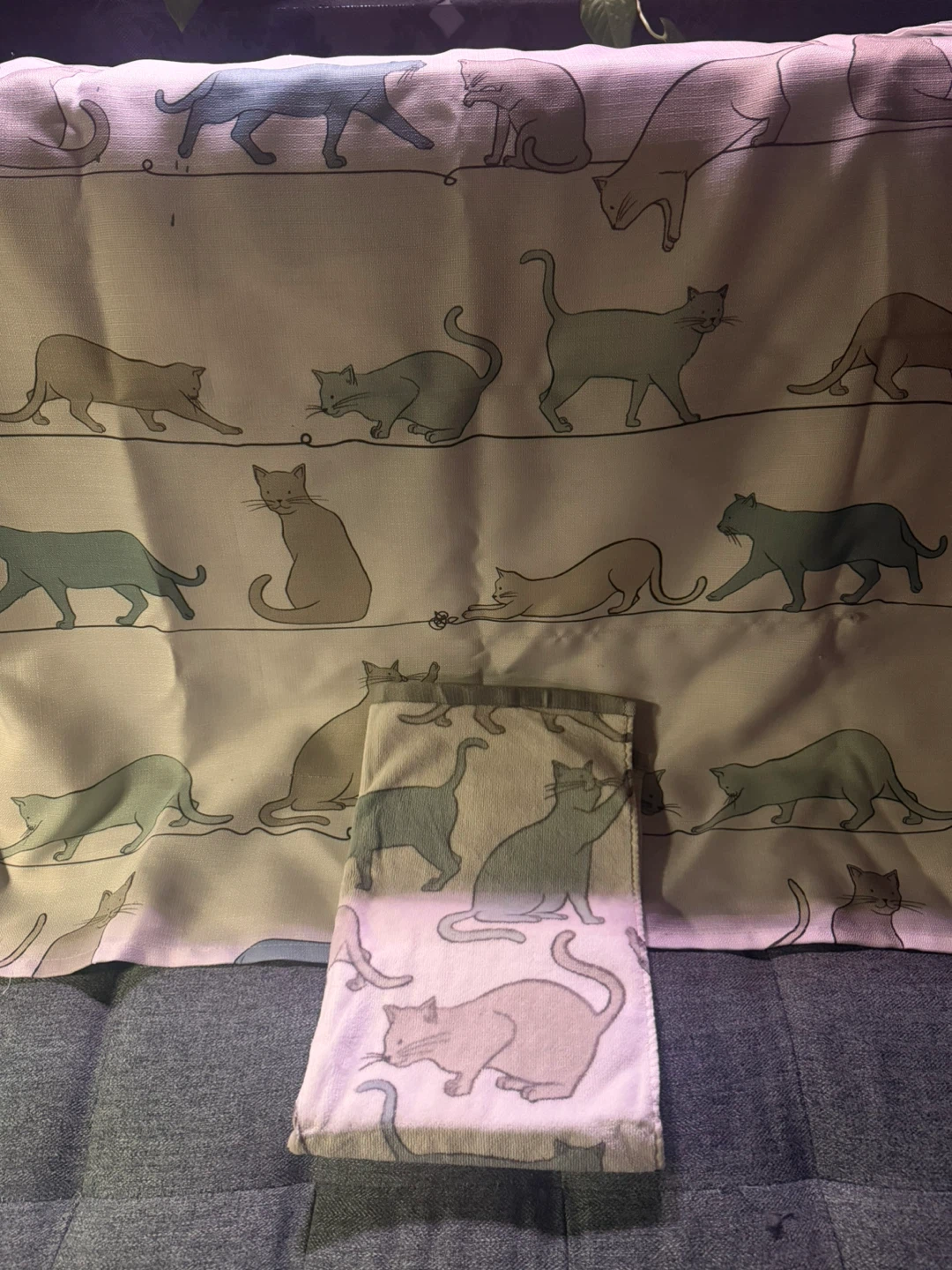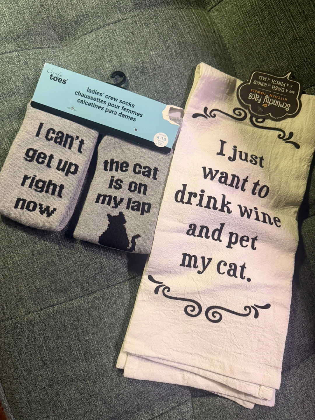 Used shower curtain with some markings (matching towel has never been used), brand new tea towel and socks.