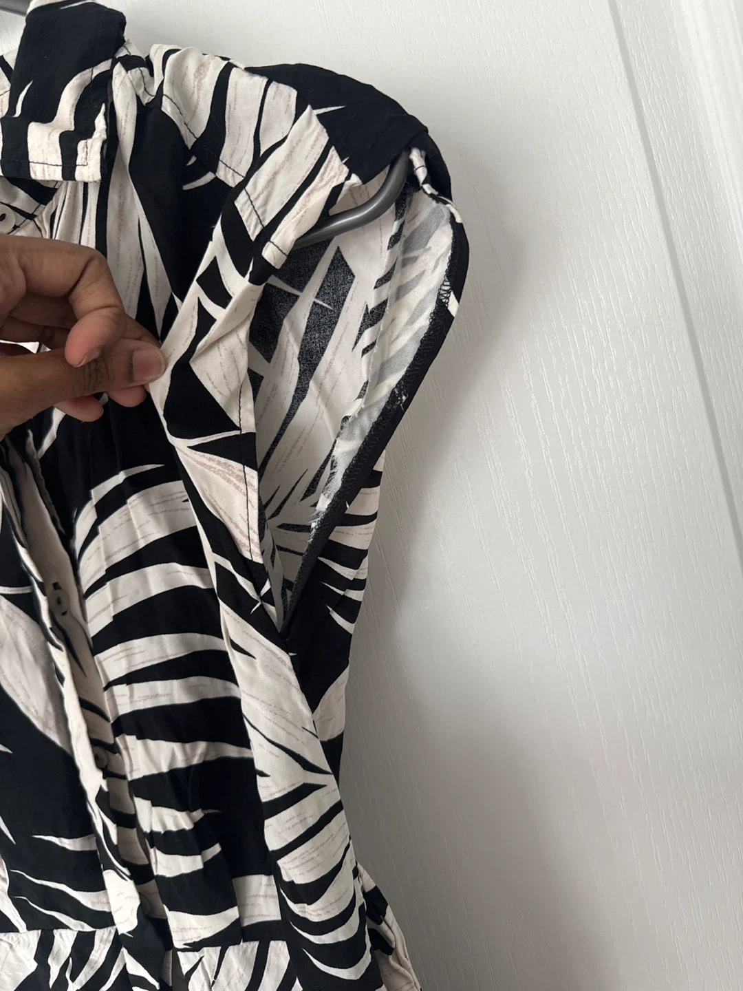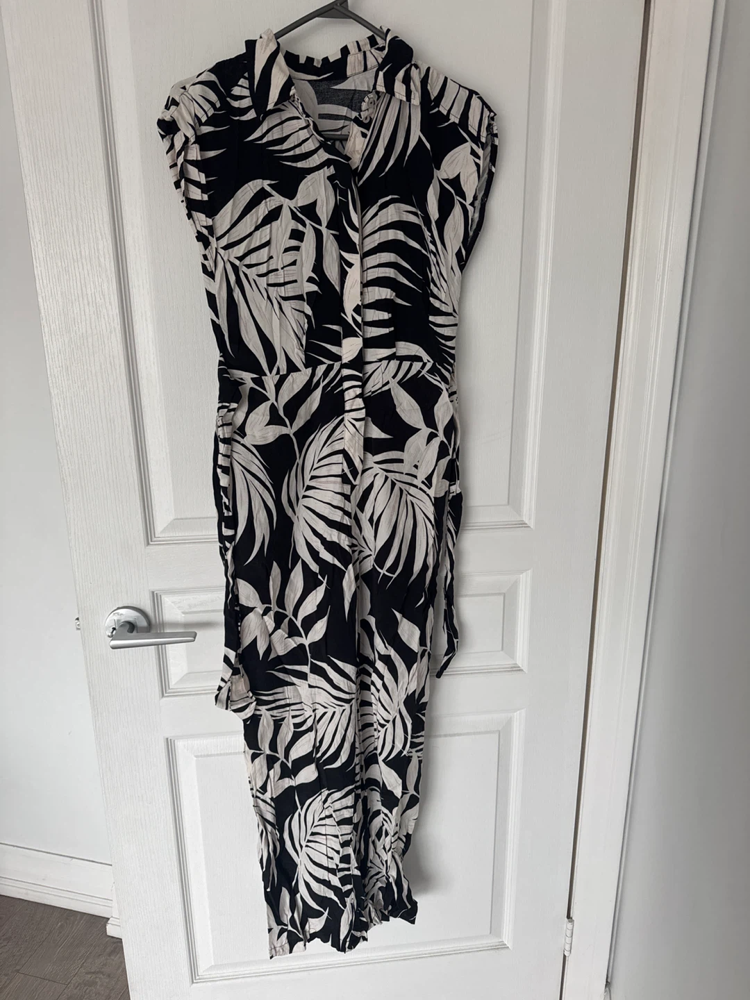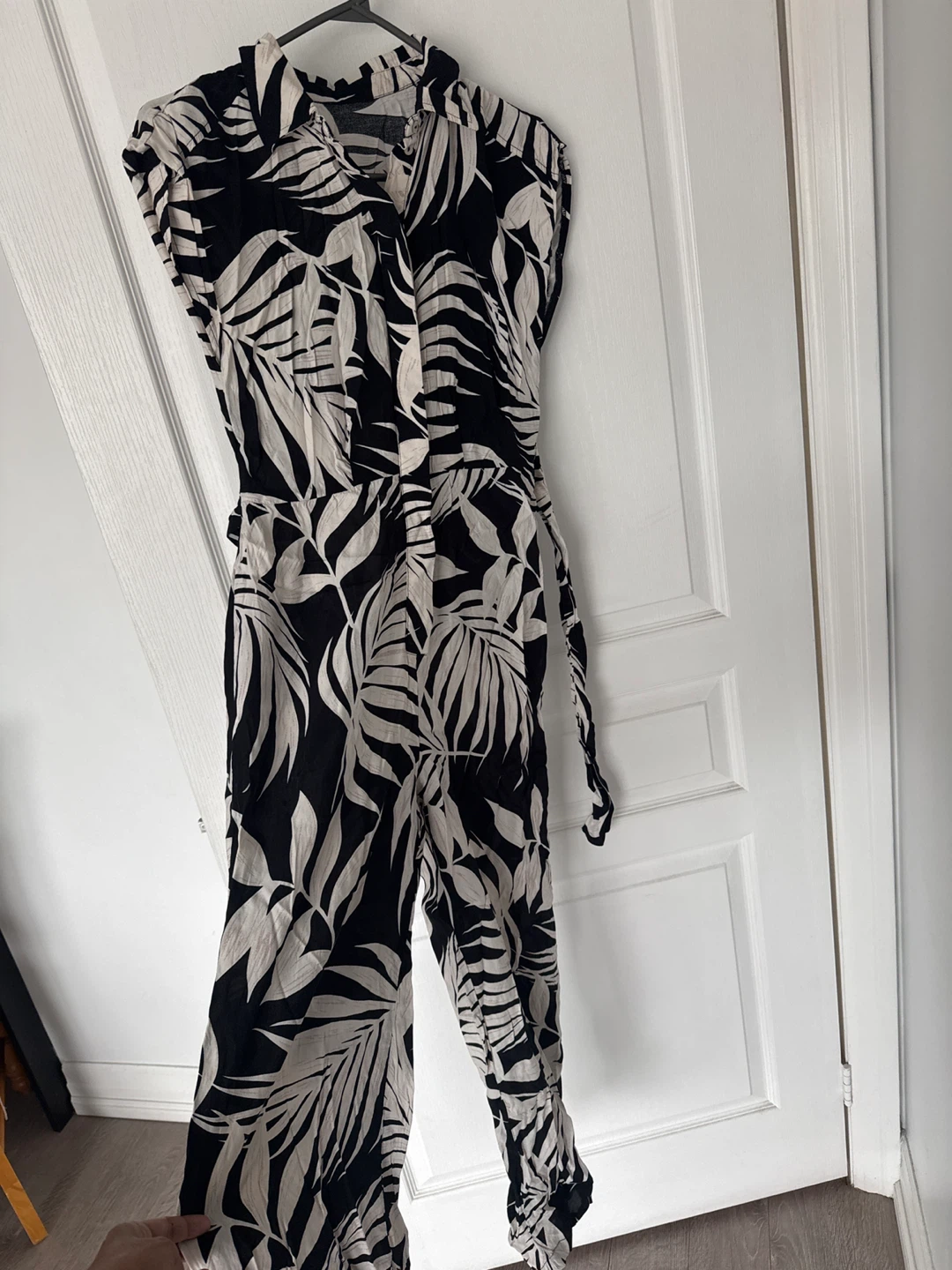 Selling this jumpsuit with a bold black and white leaf print! It's perfect for a casual day out or dressing up for an evening event.