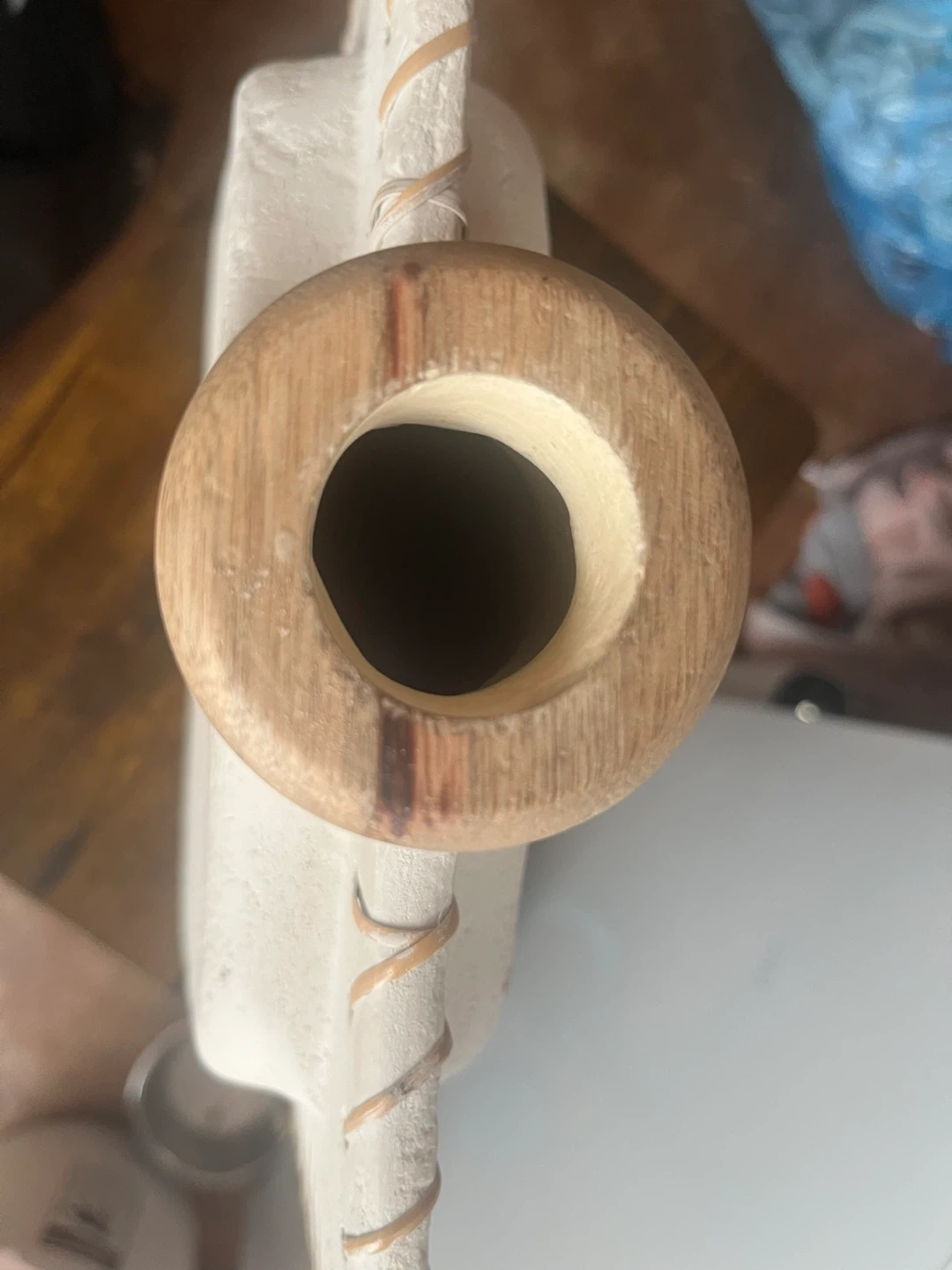 This is a lovely decorative vase, perfect for adding a touch of rustic charm to your home. It features a unique design with a textured white finish and a wooden top accent. It's in great condition and ready to brighten up any space!