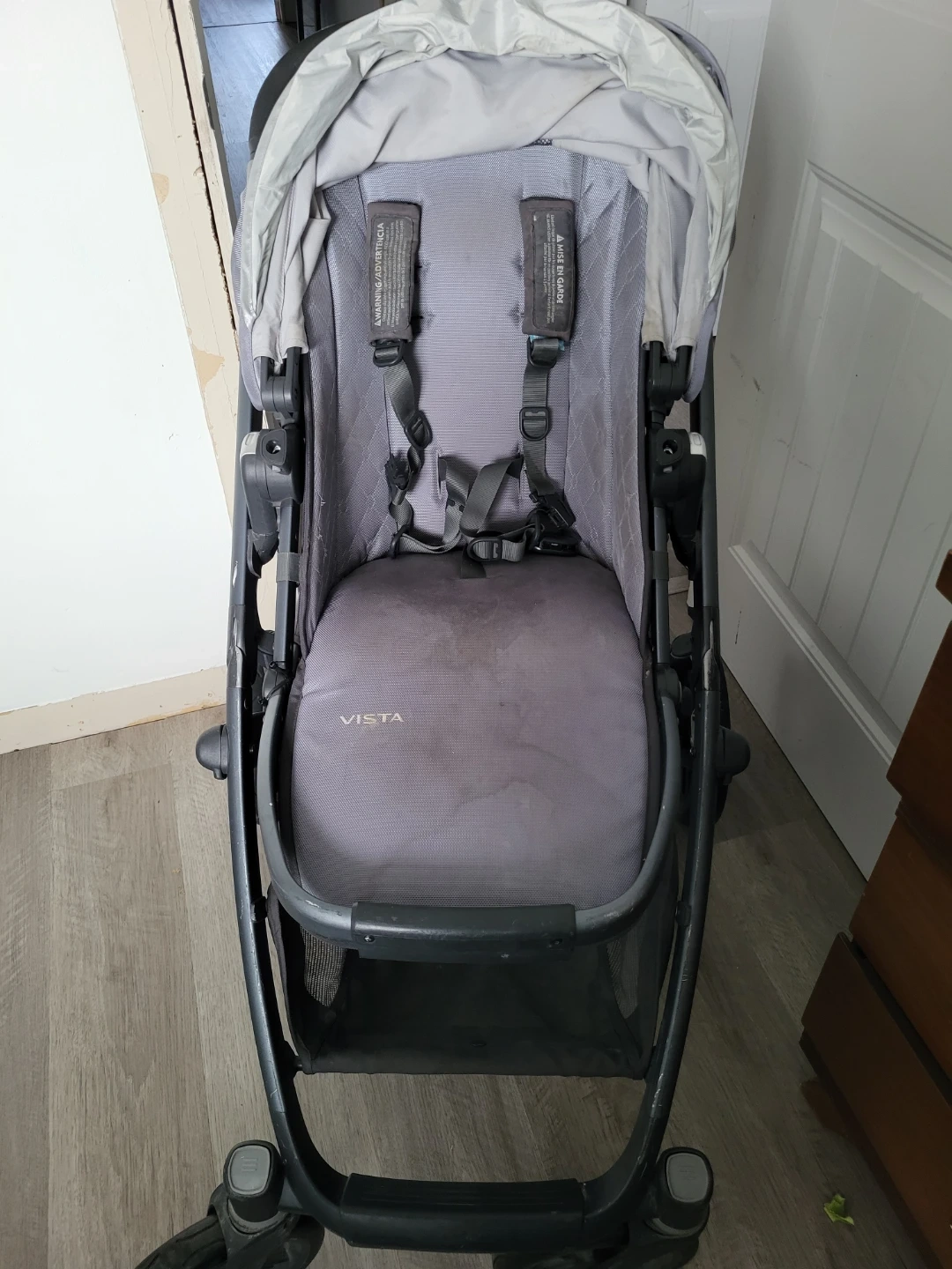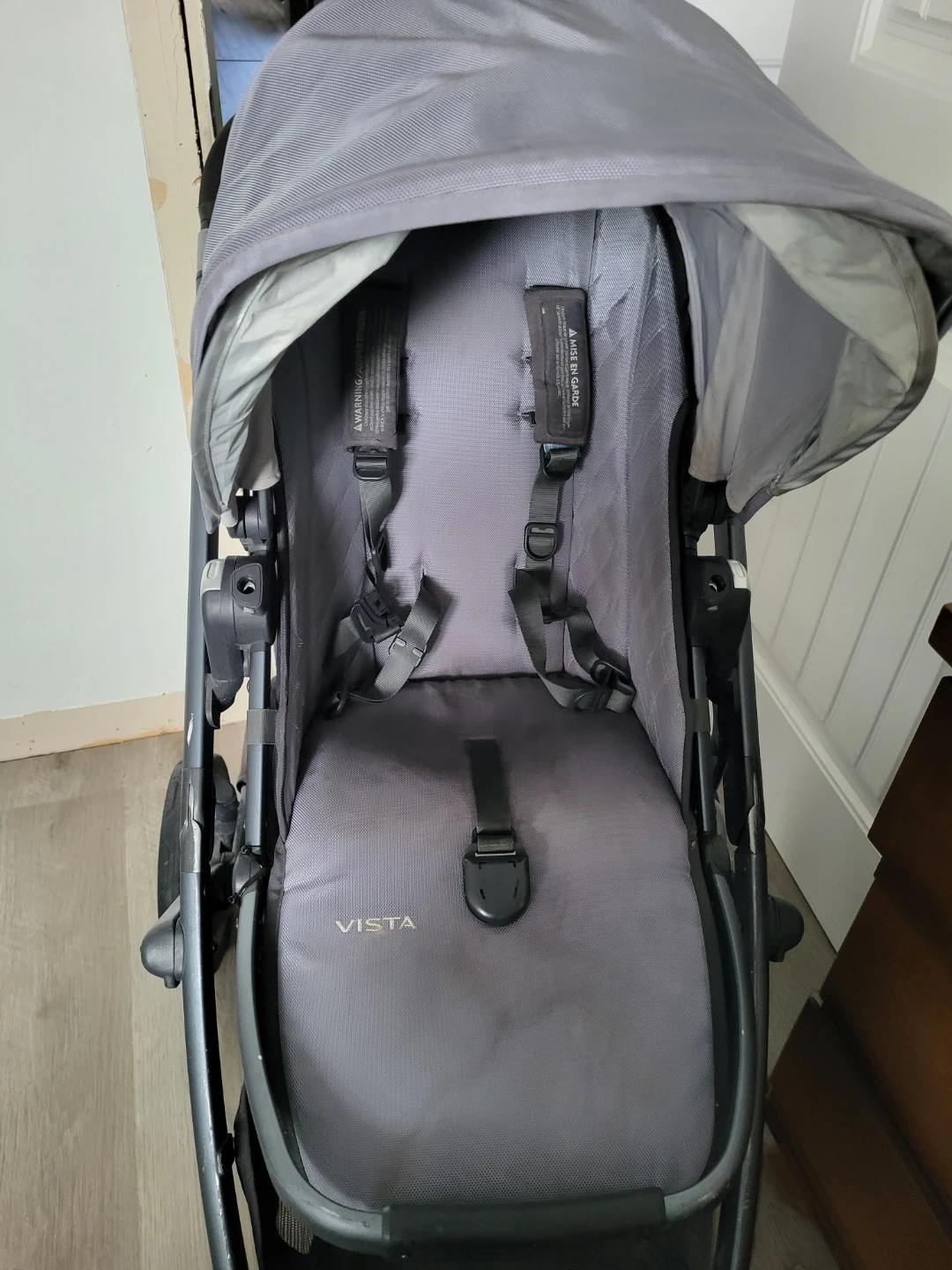 Selling a used UPPAbaby Vista stroller in grey. It's in good condition and ready for its next family. Perfect for walks around the neighbourhood or trips to the park!