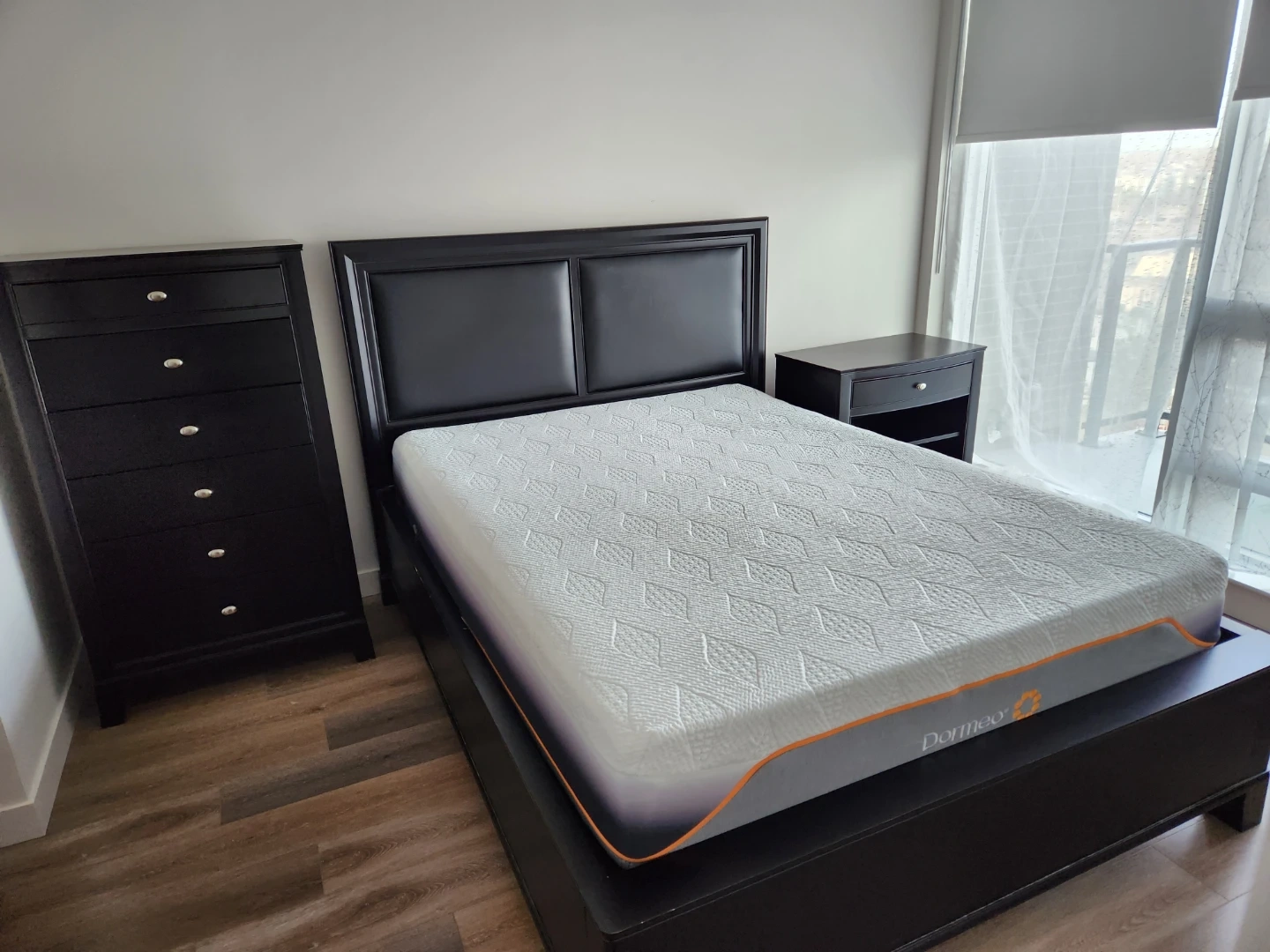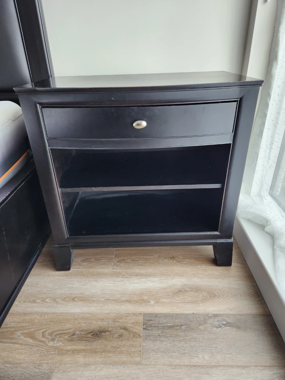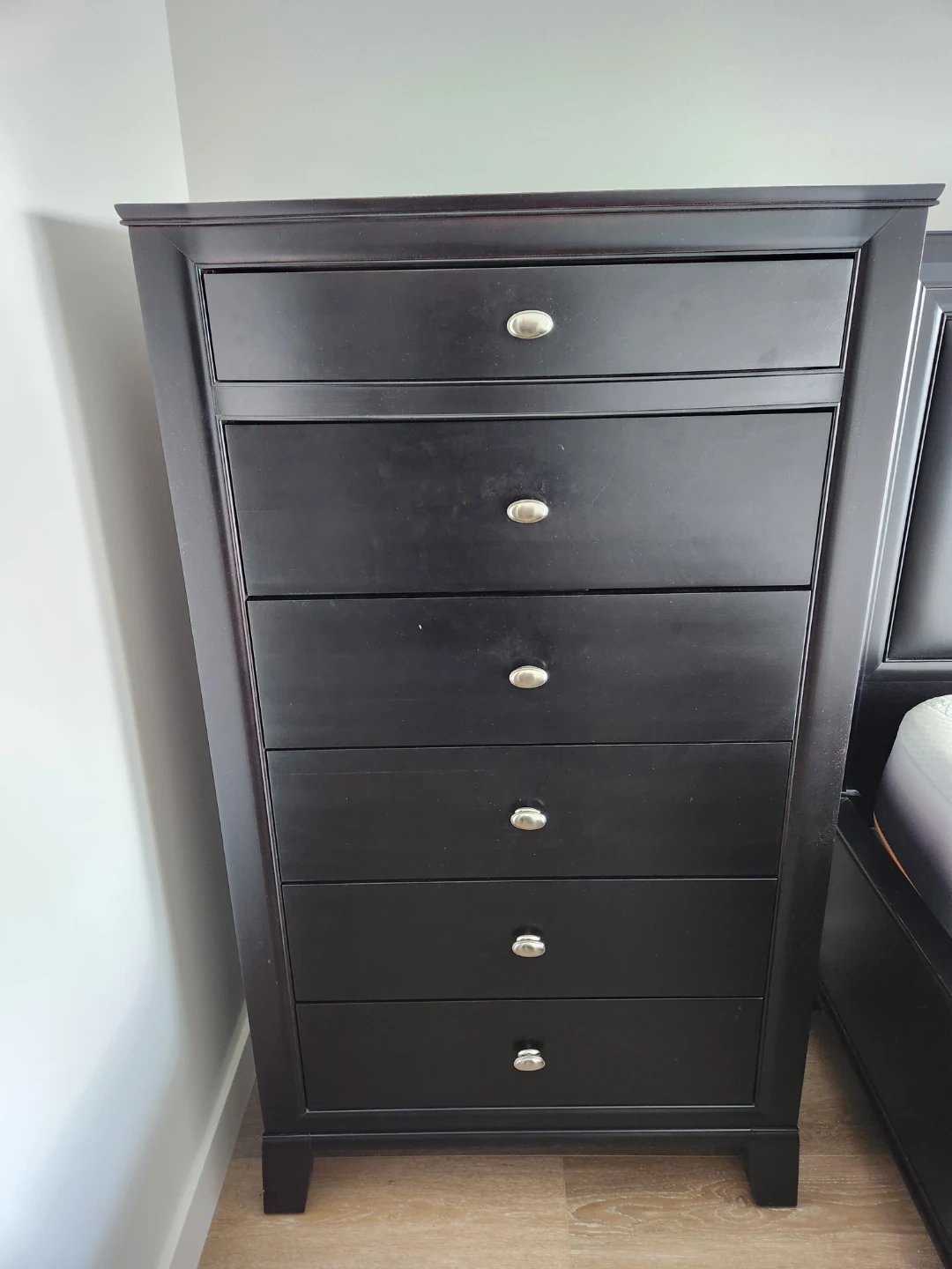 Selling a queen bedroom set that includes bed frame with leather inserts, dresser/lingerie chest, and nightstand. The set is in good condition and is heirloom quality, dovetail construction. It is solid wood, espresso colour, from TH Solidwood. It is in good condition however it is used, so there are bumps and scrapes, primarily on the frame of the bed. If you are interested in dimensions please reach out. Mattress is NOT included but can be negotiated.