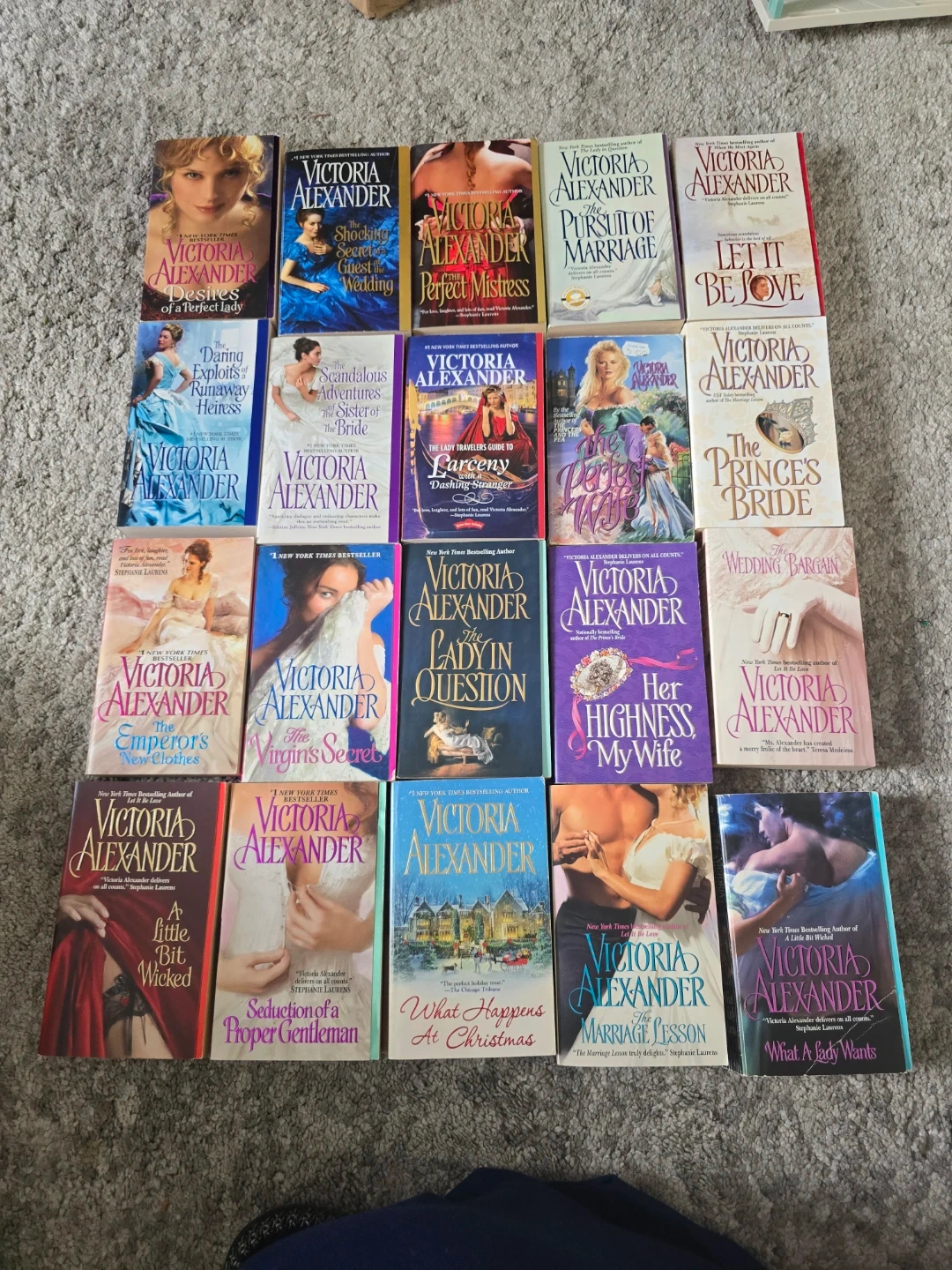 Selling a collection of Victoria Alexander romance novels! Titles include Desires of a Perfect Lady, The Shocking Secret of a Guest at a Wedding, The Perfect Mistress, The Pursuit of Marriage, Let It Be Love, and many more! Perfect for anyone who enjoys historical romance novels.