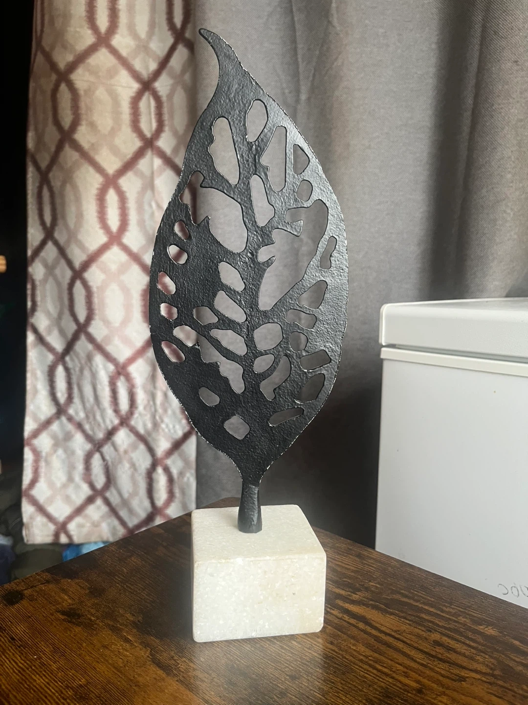 This is a lovely metal leaf sculpture mounted on a marble base. It would look great as a decorative piece in any room of your house!