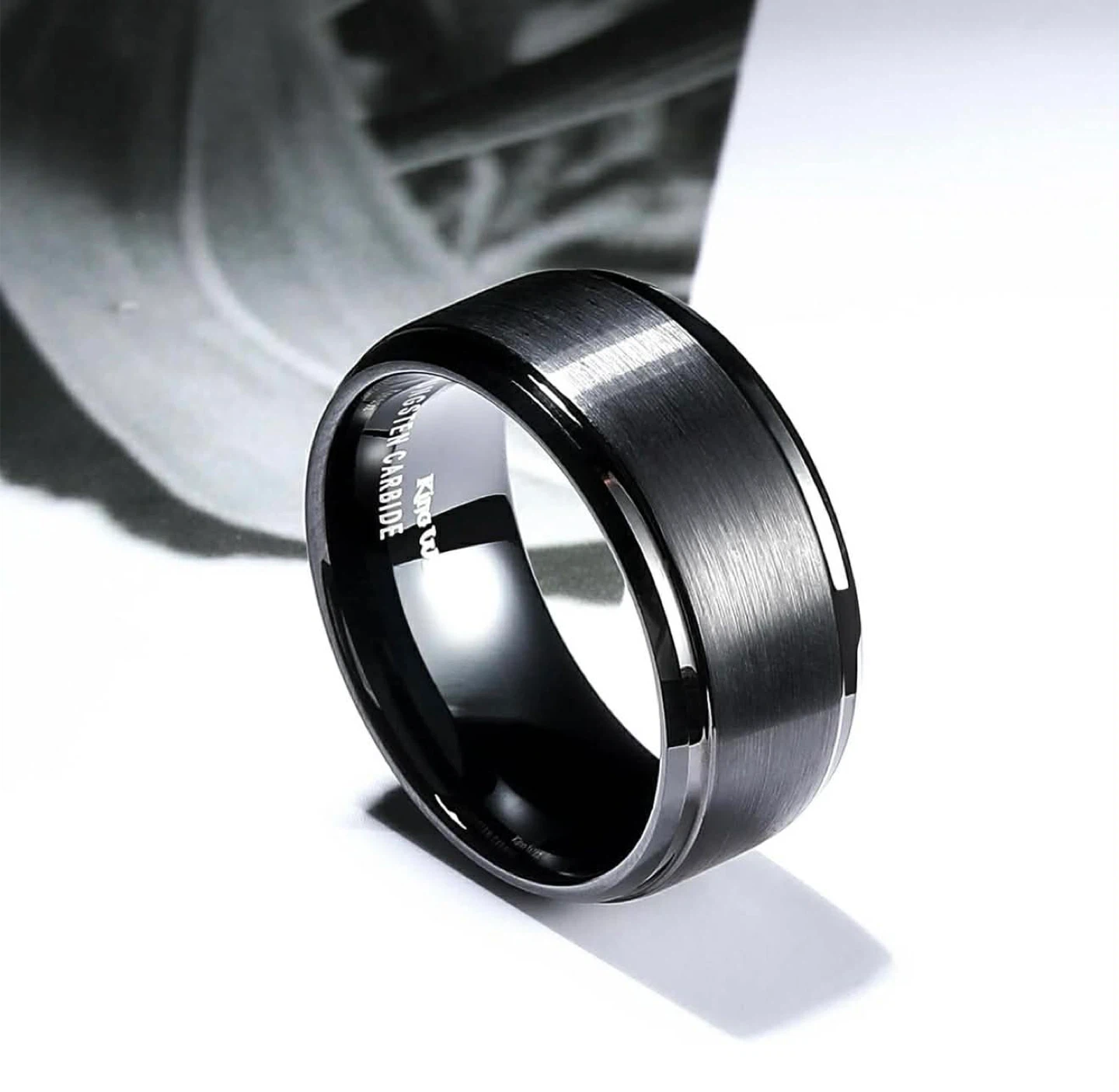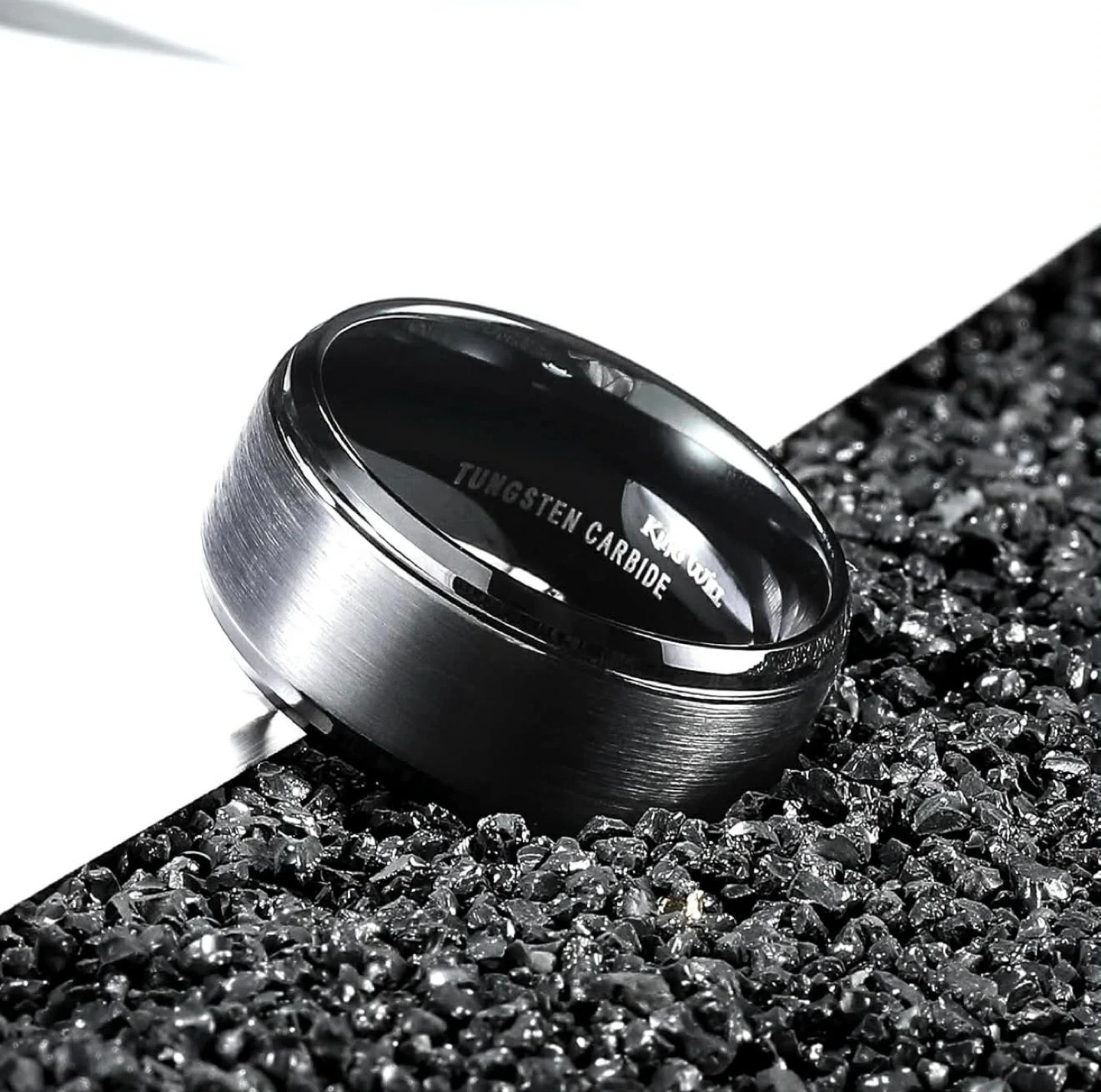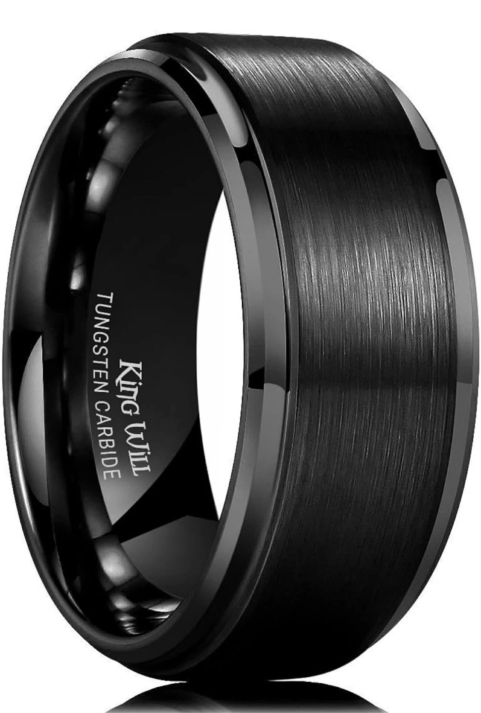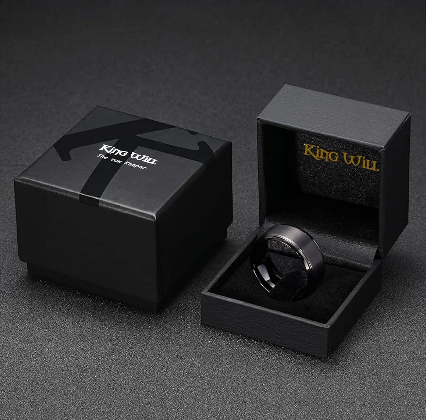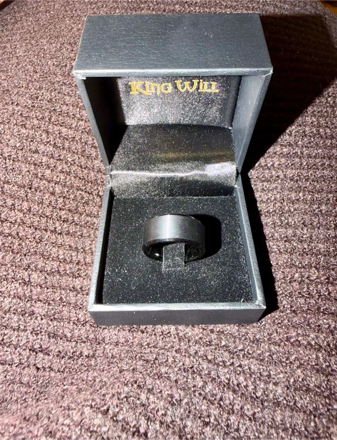 This is a King Will ring made of tungsten carbide. It comes with its original box. The ring has a sleek, modern look!