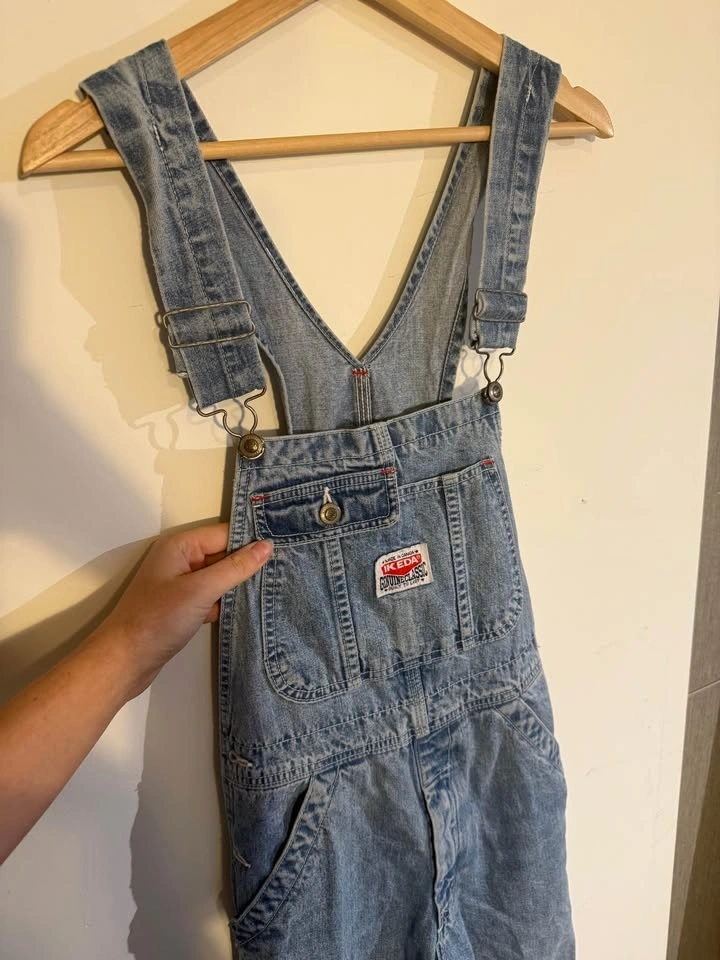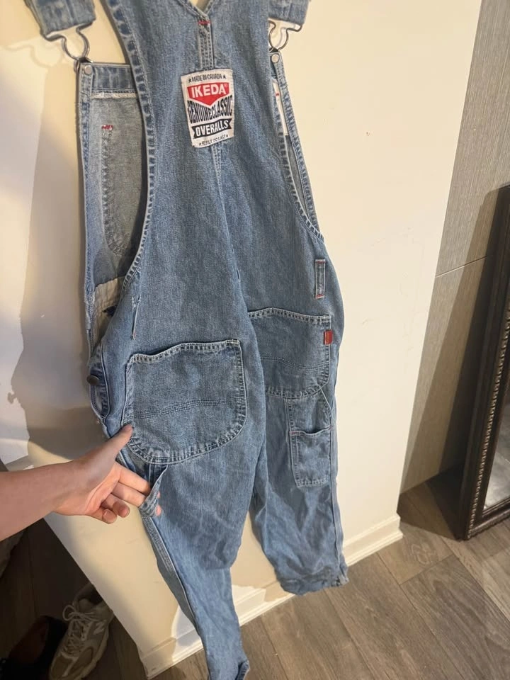 Authentic vintage IKEDA denim overalls, made in Canada. Classic blue workwear denim with adjustable straps, multiple utility pockets, and original IKEDA patches. 100% cotton, heavy-duty construction. Excellent condition. Priced at $40.