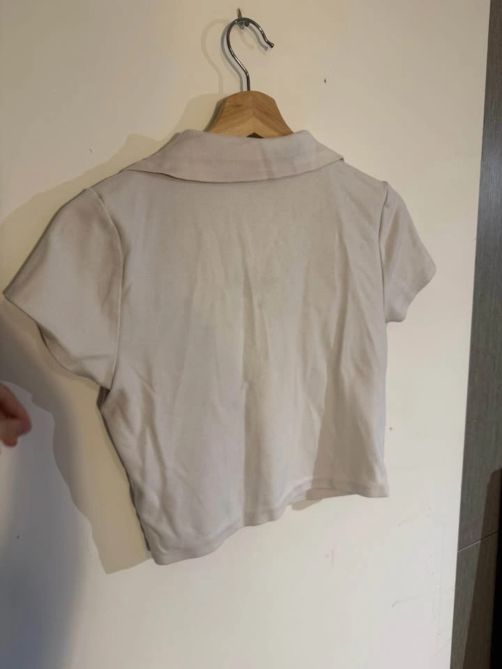 Sundeh short-sleeve half-zip polo top in a light beige/stone colour — size L. Soft, stretchy fabric with structured collar and functional front zipper. Minimal, elevated casual piece. Well taken care of, lightly worn, no noticeable flaws. Priced at $25.
