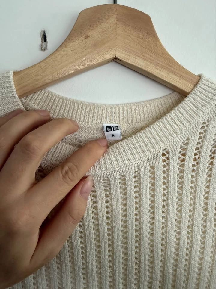 UNIQLO knit sweater vest, women’s size M — soft cream colour with breathable open-knit texture; sleeveless, lightweight, and perfect for layering. Original price approx. $40 selling for $15.