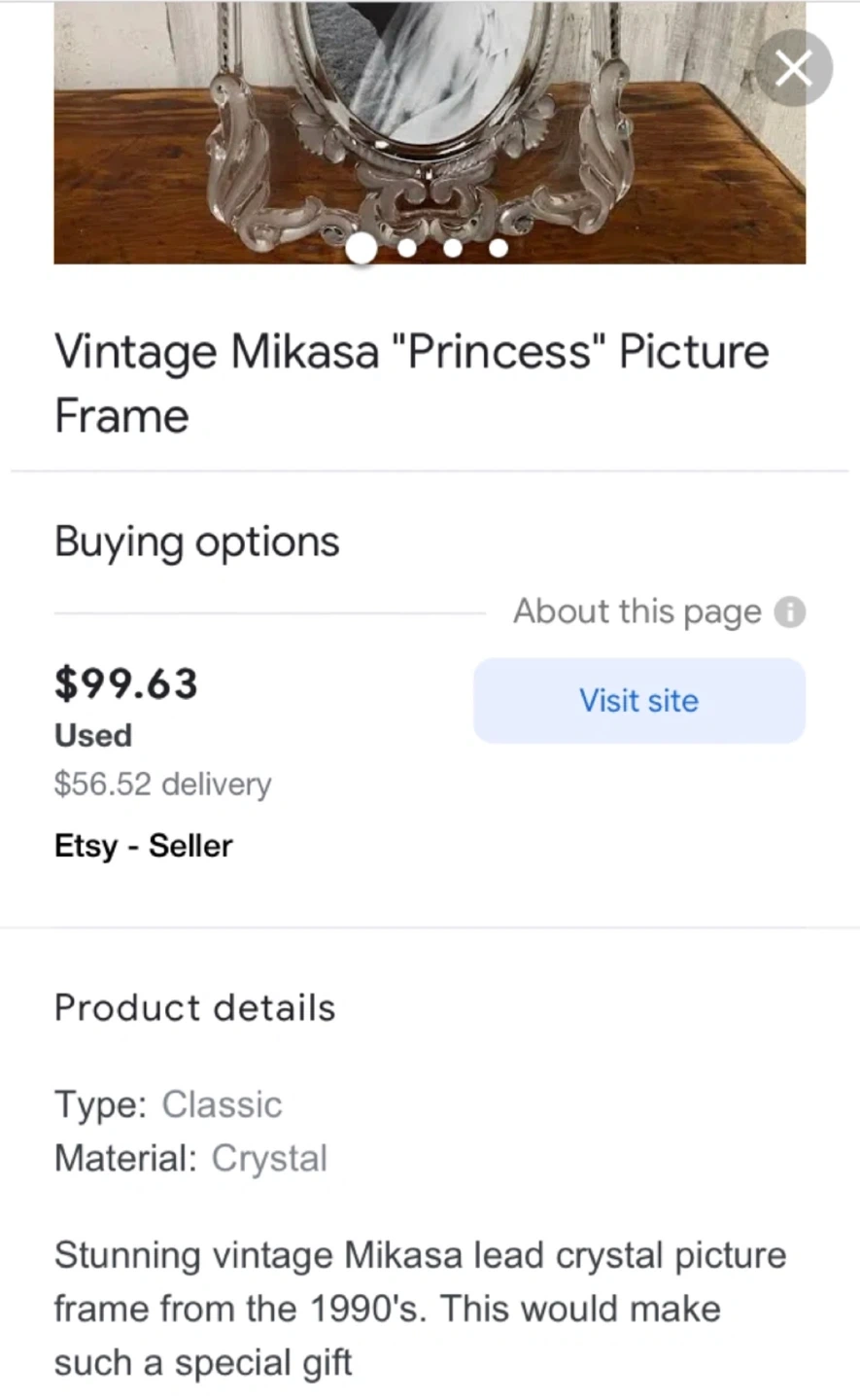 Selling a beautiful vintage Mikasa "Princess" picture frame! It's made of crystal and has a lovely floral design. Perfect for displaying your cherished memories