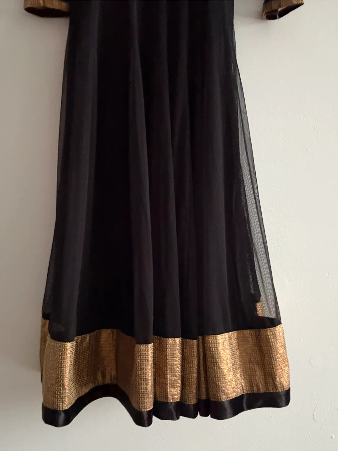 Beautiful black Anarkali dress with intricate gold embroidery. It's in great condition and perfect for a special occasion! The dress features a flowing skirt and elegant design.