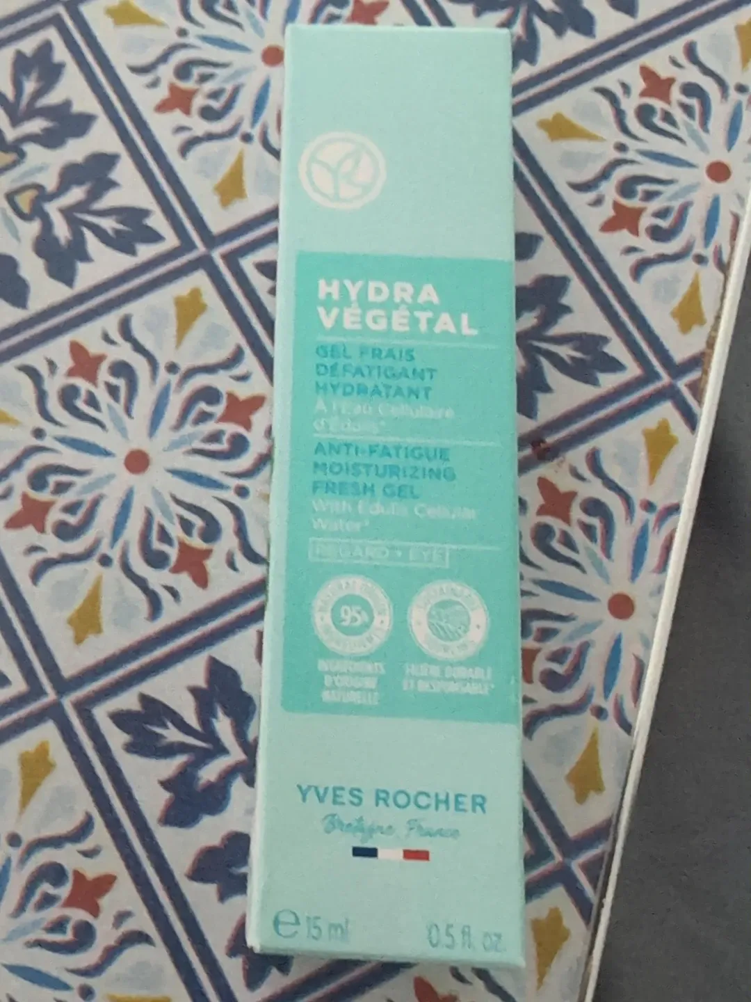 Selling a Yves Rocher Hydra Vegetal Anti-Fatigue Moisturizing Fresh Gel. It's a gel with edulis cellular water. It contains 15ml / 0.5 fl oz. The manufacturing date is 2028 July