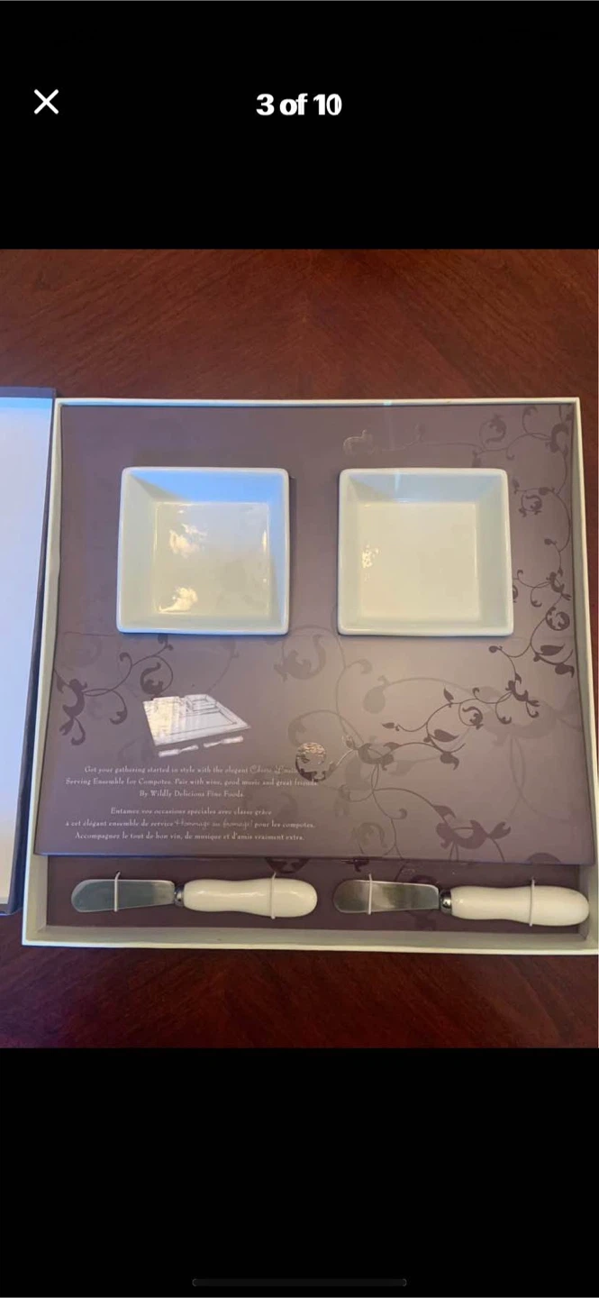 Selling a brand new Cheese Louise! Cheese Serving Ensemble for Compotes by Wildly Delicious Fine Foods. It's an elegant ensemble de service a fromage pour les compotes. A set elegant ensemble de service a fromage pour les compotes. Accompgne tout les fois ou fromage et desserts seraient extras