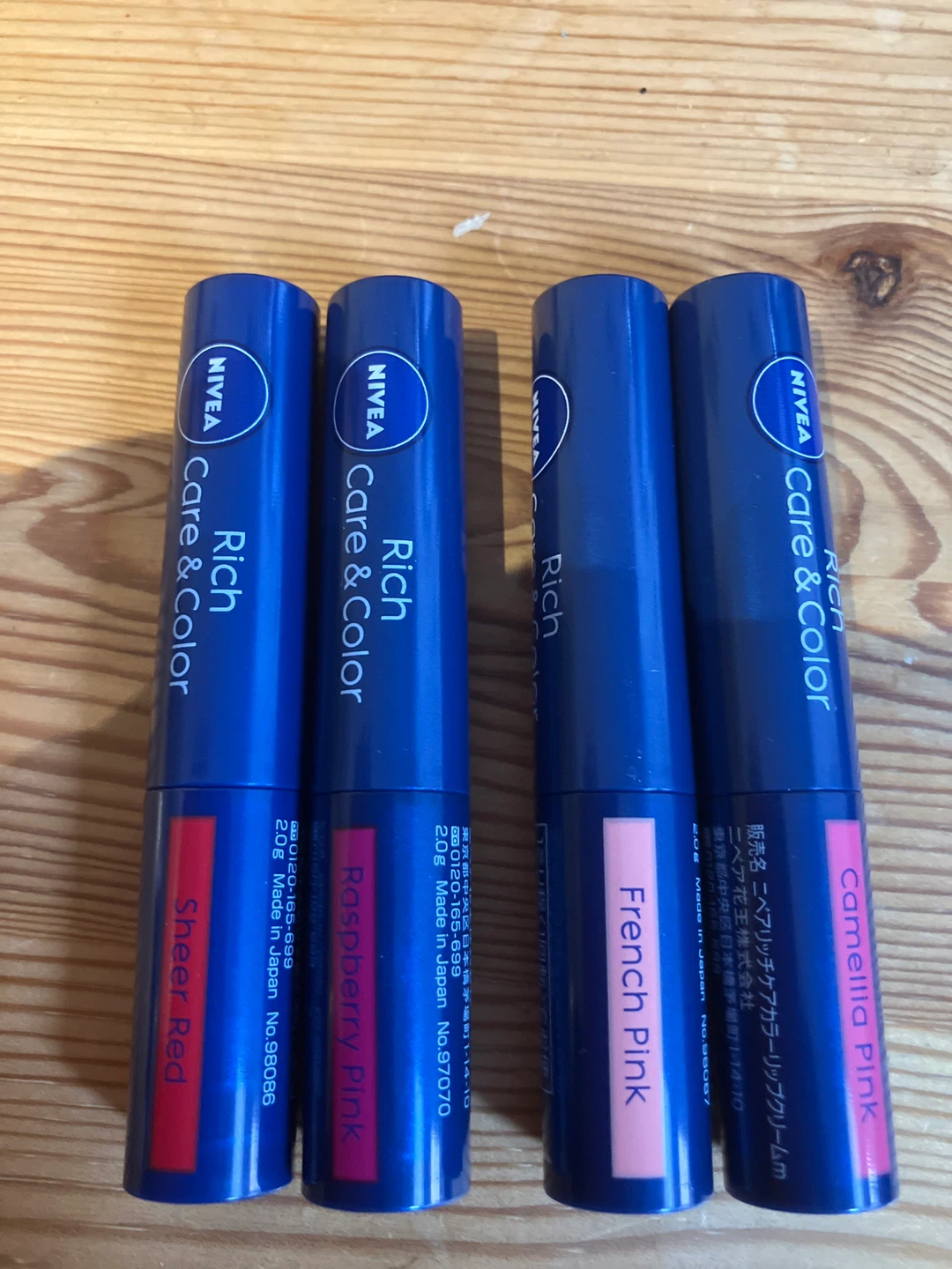 I'm selling Nivea Rich Care & Color lip balms. Available in Sheer Red, Raspberry Pink, French Pink, and Camellia Pink. Each balm is 2.0g and made in Japan.