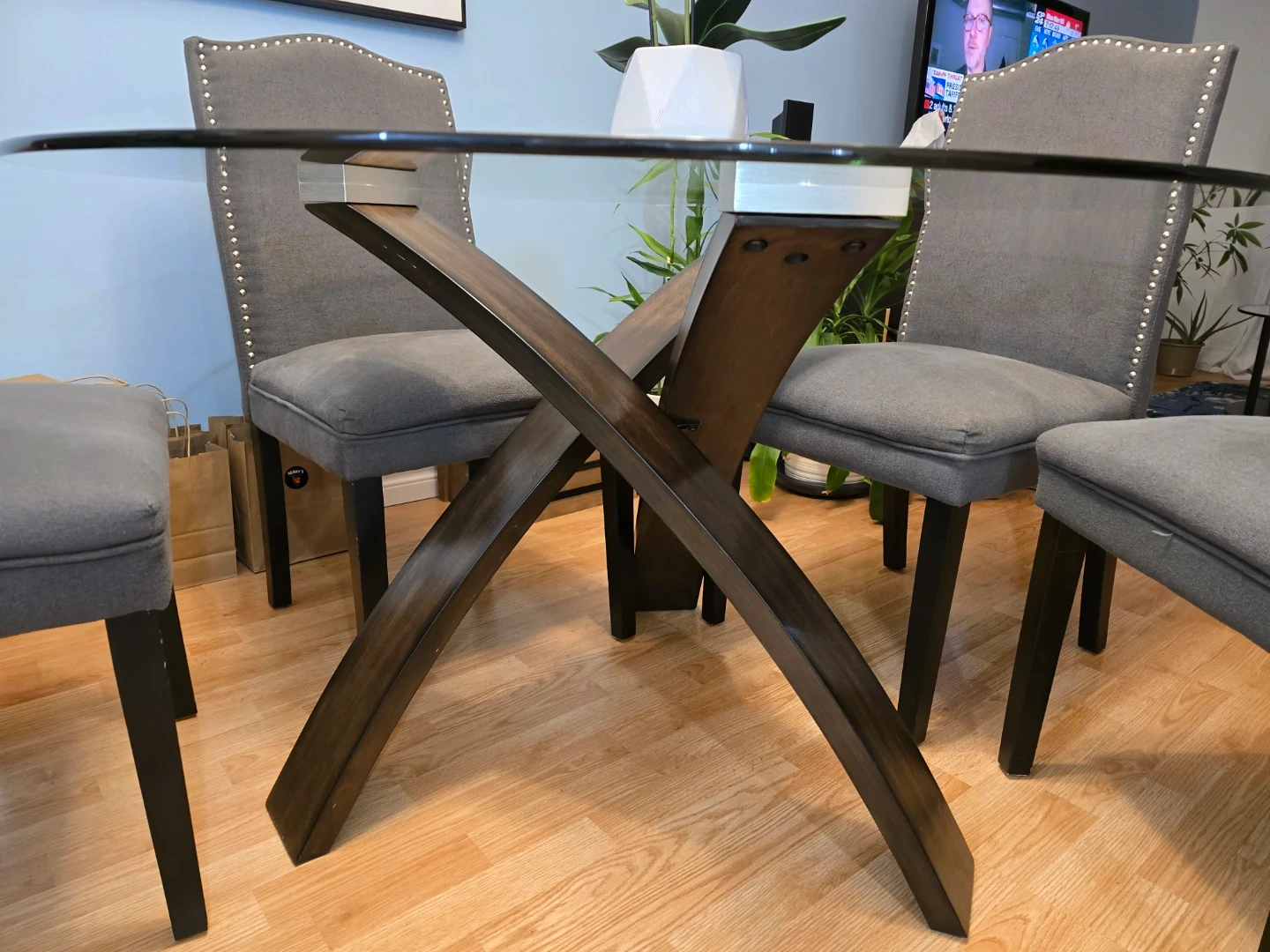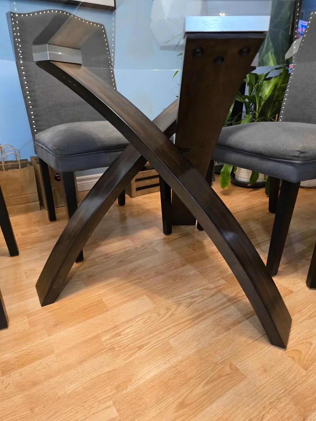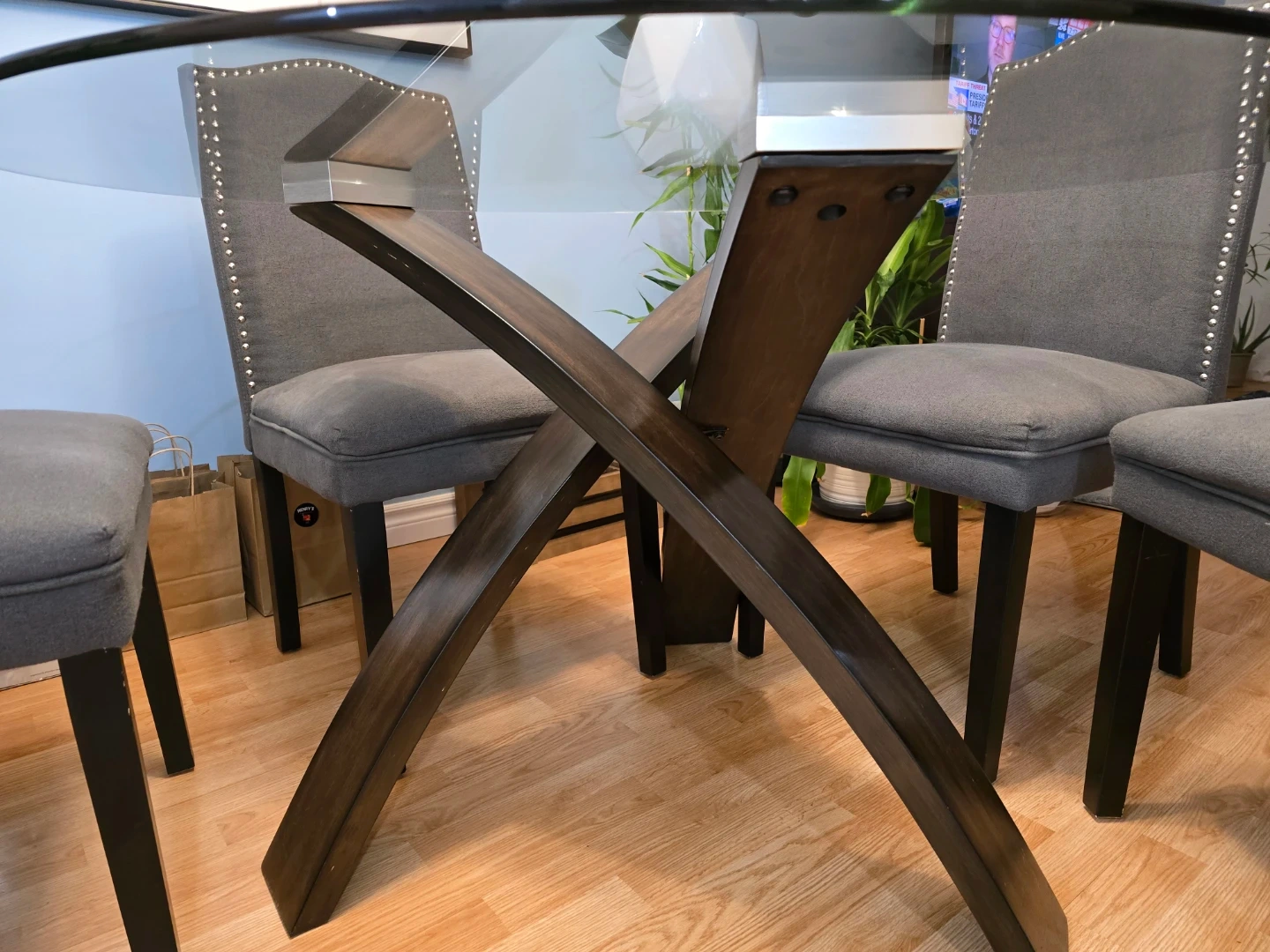 Four-chair dining set. Glass tabletop and dark wood base. Dark grey fabric chairs.