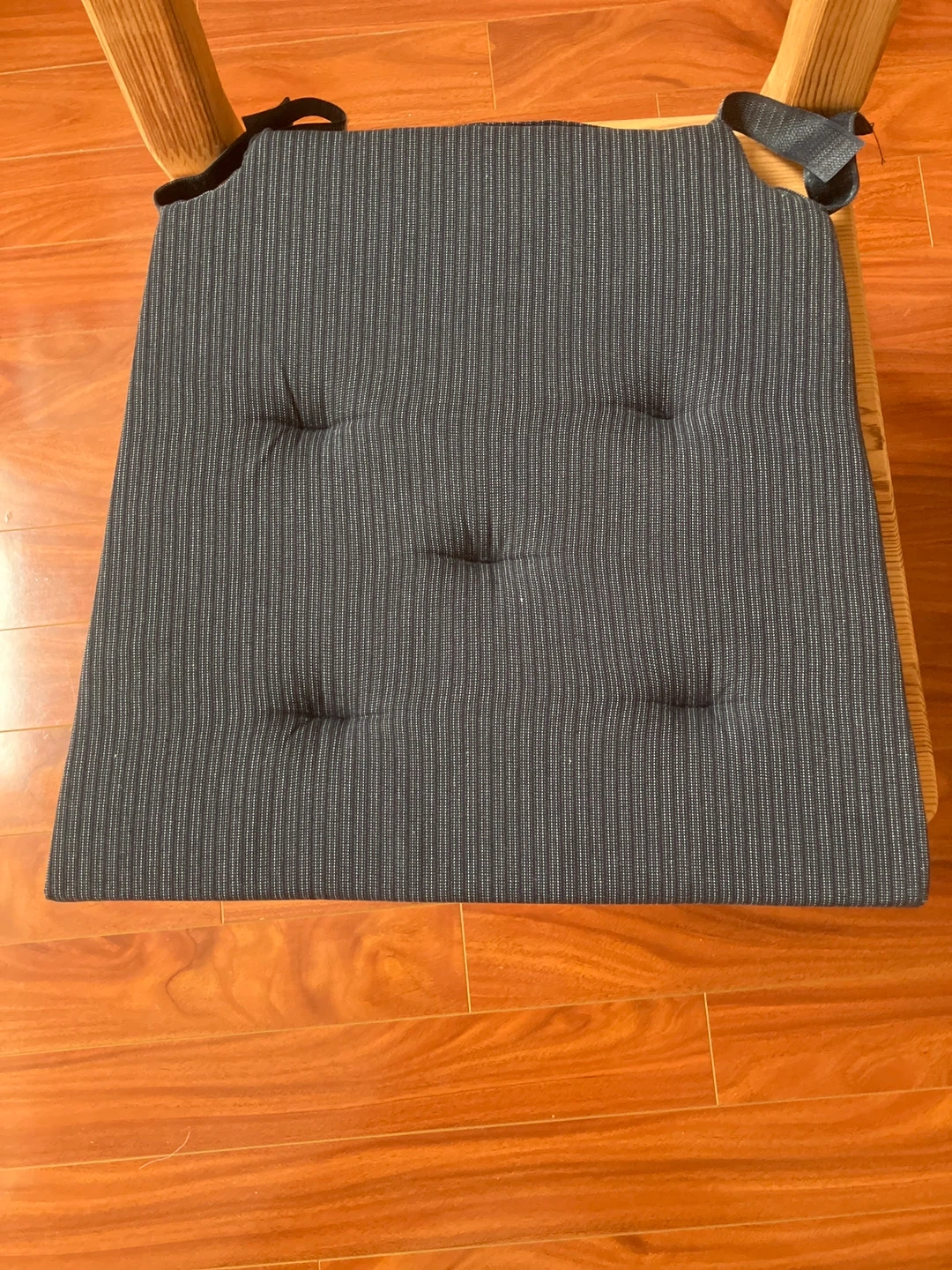 Here's a comfy chair pad! It's navy blue with a subtle striped pattern and has ties to keep it securely in place. Perfect for adding a little extra comfort to your dining or kitchen chairs.