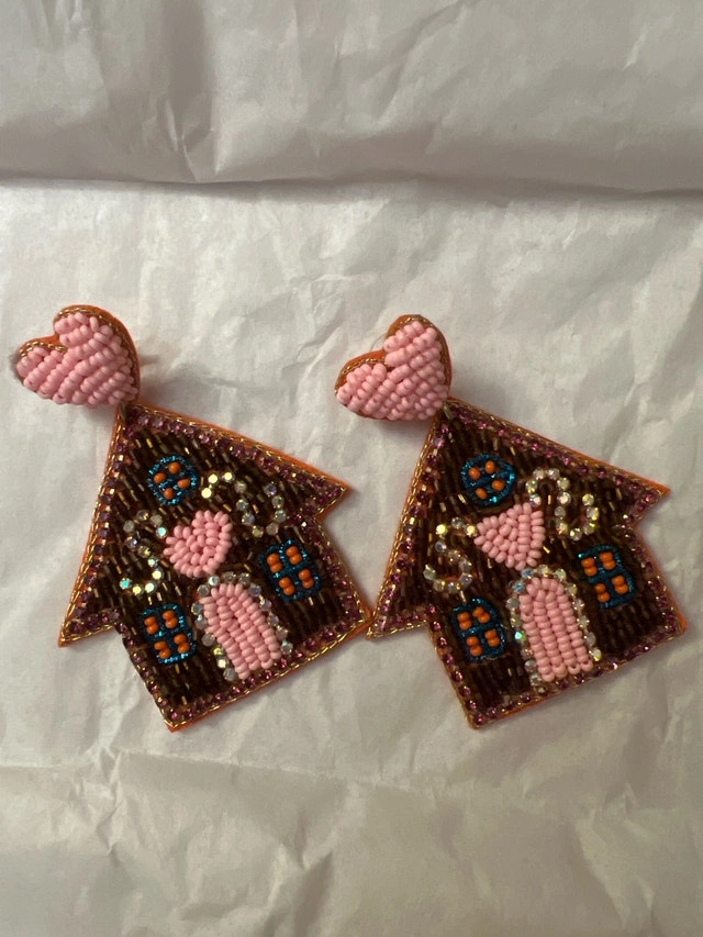 Add a touch of whimsy to your outfit with these charming, gently hand beaded house earrings. These unique earrings feature a playful house design, complete with delightful beadwork that catches the eye. P.S. If you're seeing this ad, then yes, they're still available!