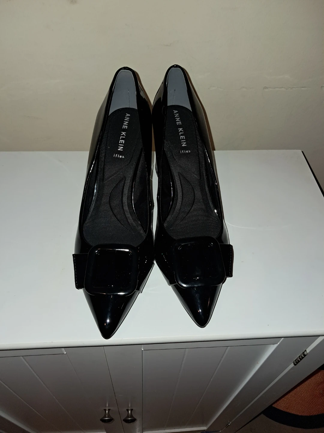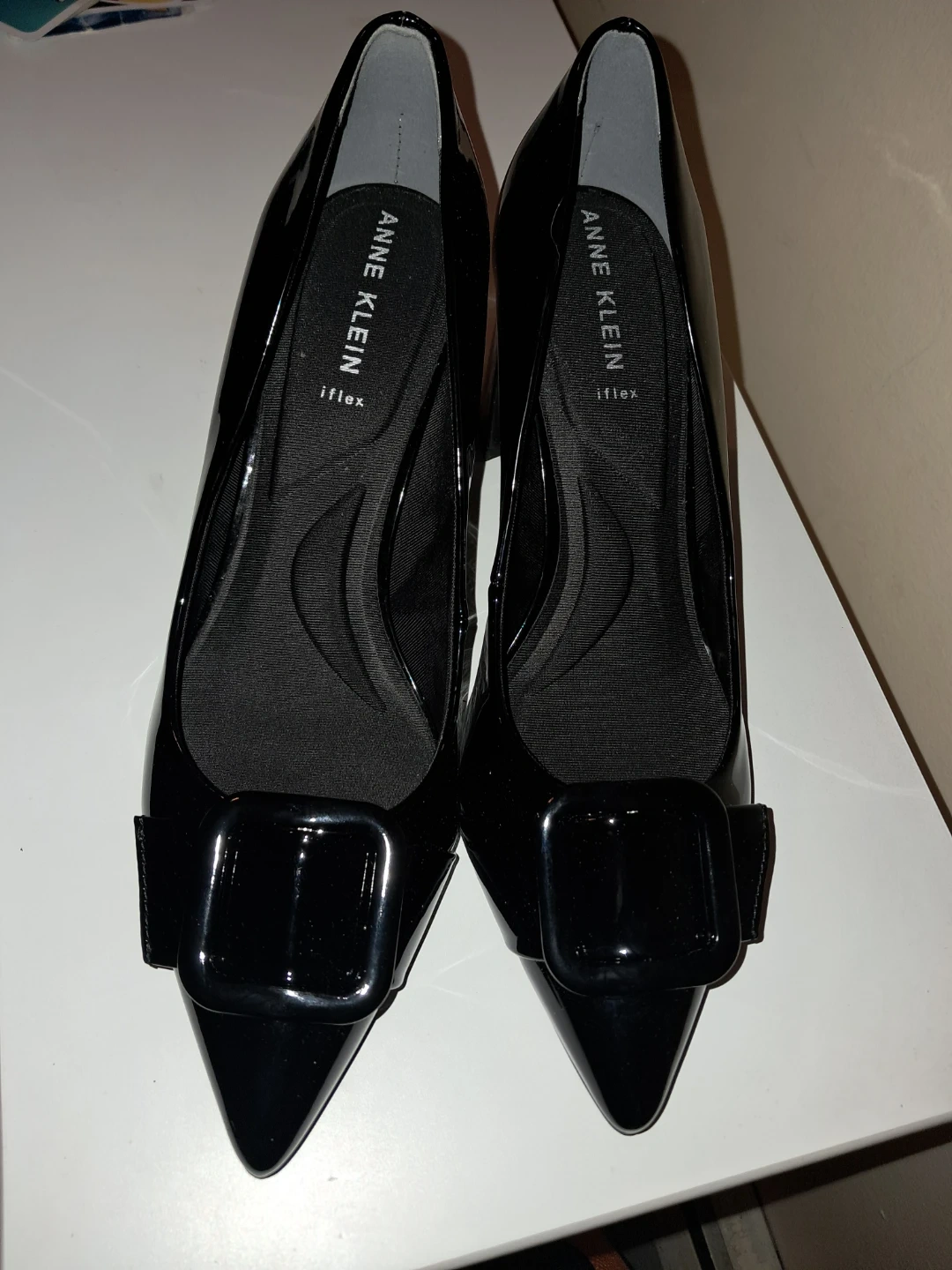 Selling a pair of Anne Klein heels in black patent leather. They have a stylish buckle detail and the iflex technology for added comfort. Perfect for dressing up or a night out