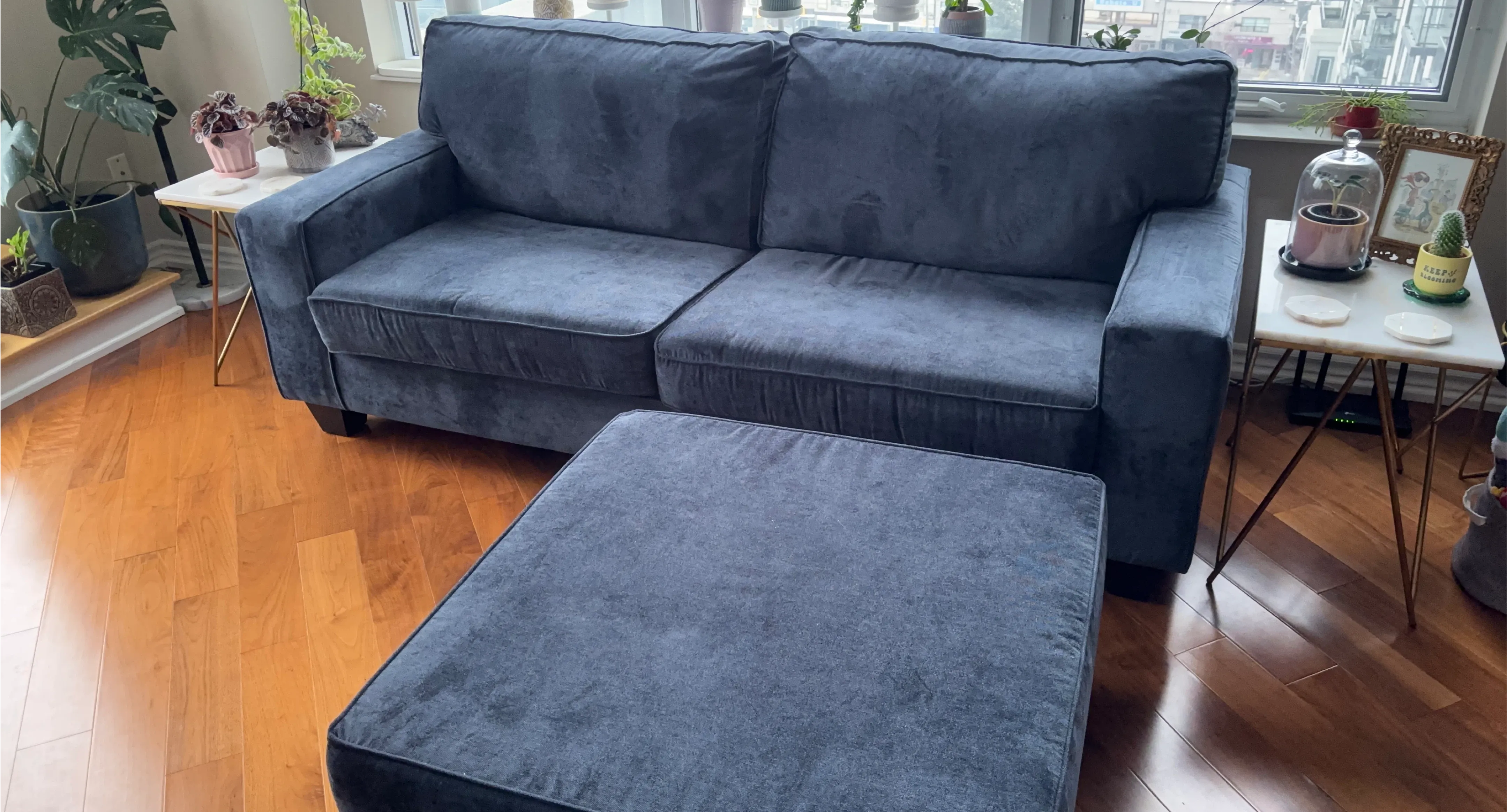 Selling a comfy blue loveseat sofa with a matching ottoman! It's in great shape and would be perfect for a smaller living space or apartment. The material is soft and cozy, ideal for relaxing after a long day. It has a modern look that would fit in with most decor styles, too