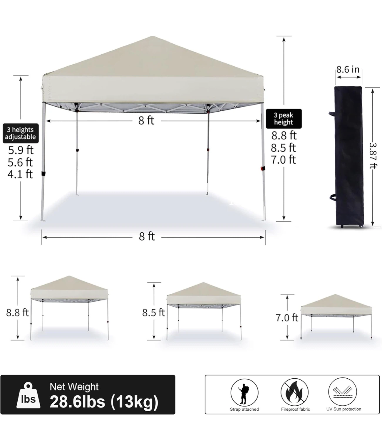 Pop Up Canopy Tent 8X8 FT,Easy Set-up Sade,Instant Shelter w/Canopy Cover,4 Ropes,Adjustable Straight Leg Heights Canopies,Outdoor Patio Tents for Parties,Commercial,White