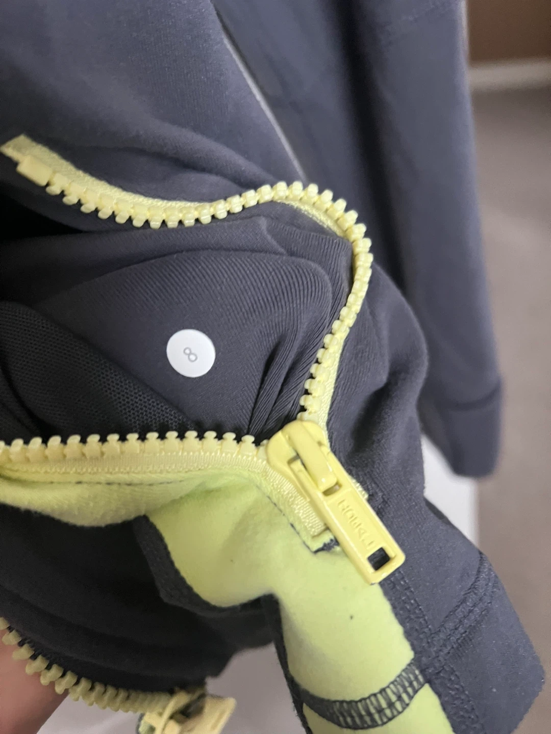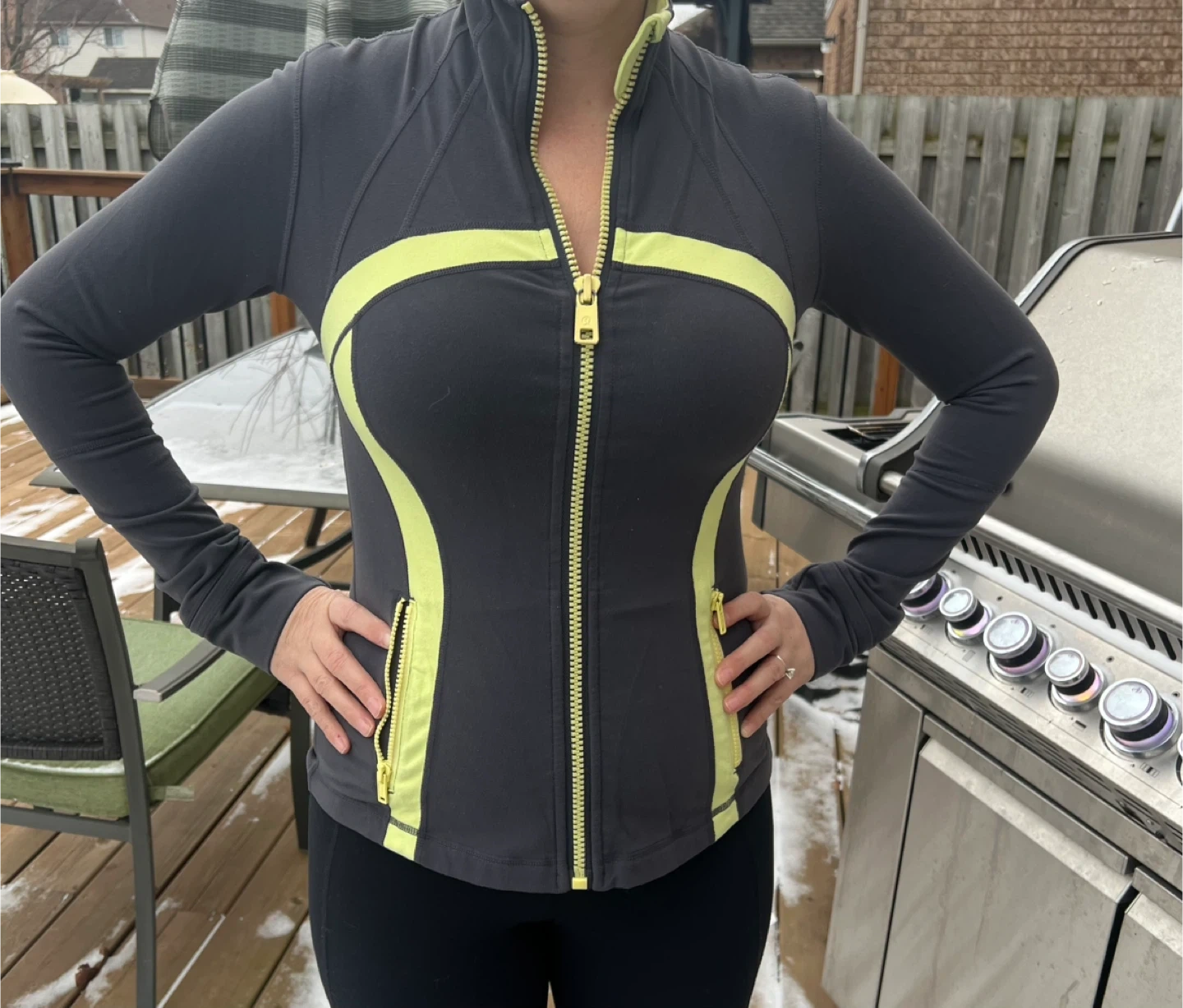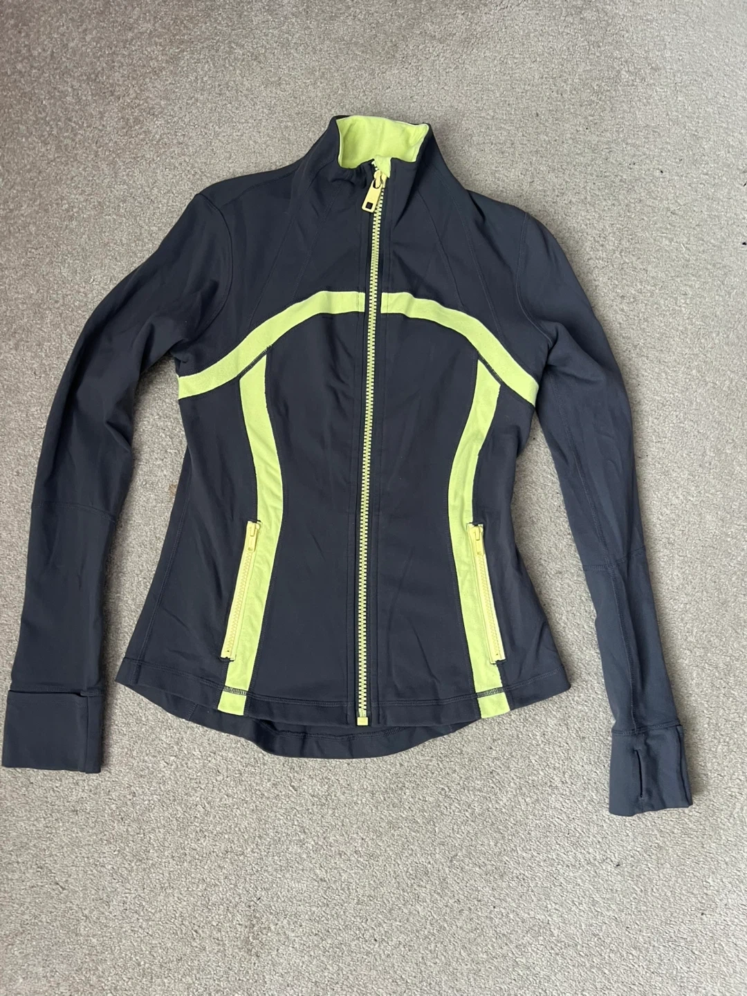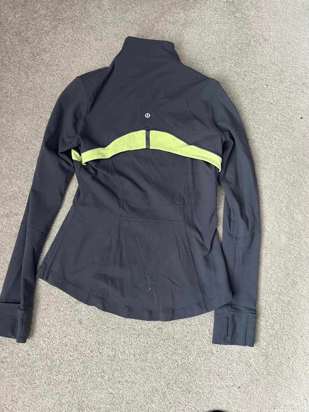 Selling a gently used Lululemon jacket in size 8. It's a stylish grey colour with yellow accents. Perfect for workouts or casual wear!