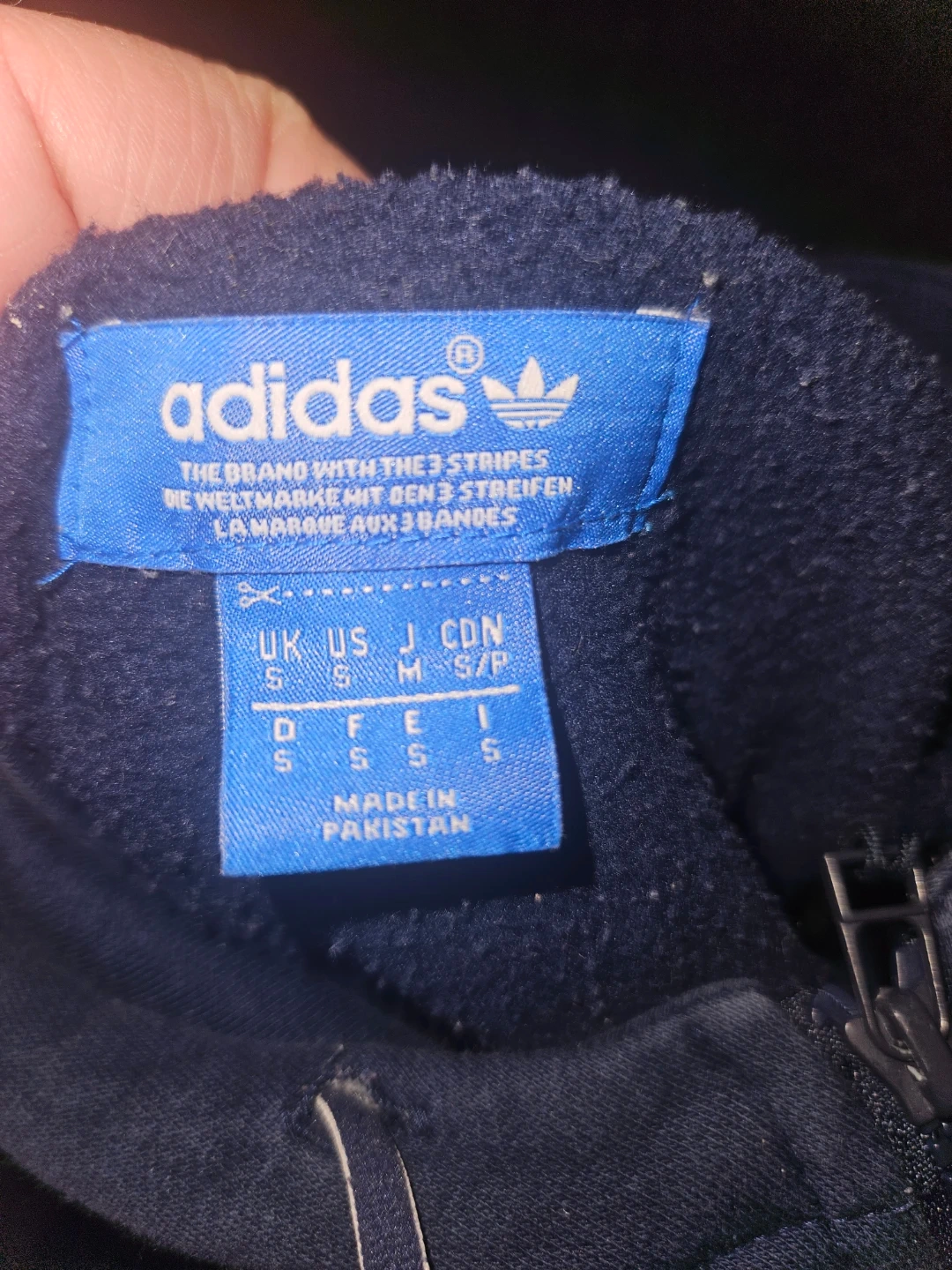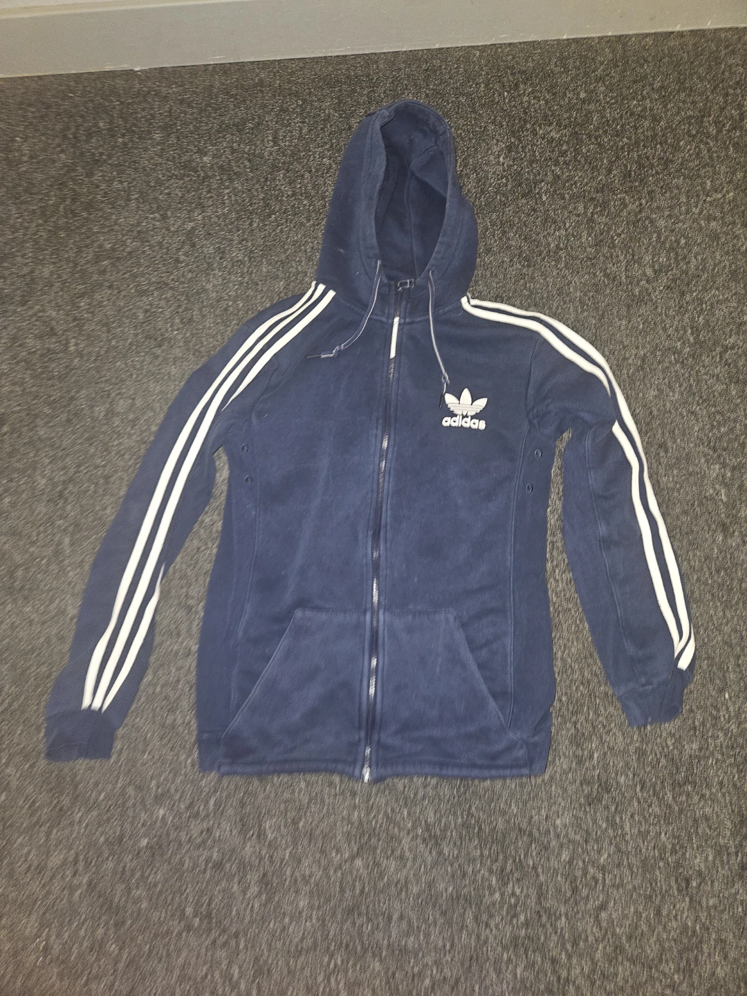 Here's an Adidas hoodie in size S. It's a nice blue colour and features the classic three stripes on the sleeves. Perfect for casual wear!