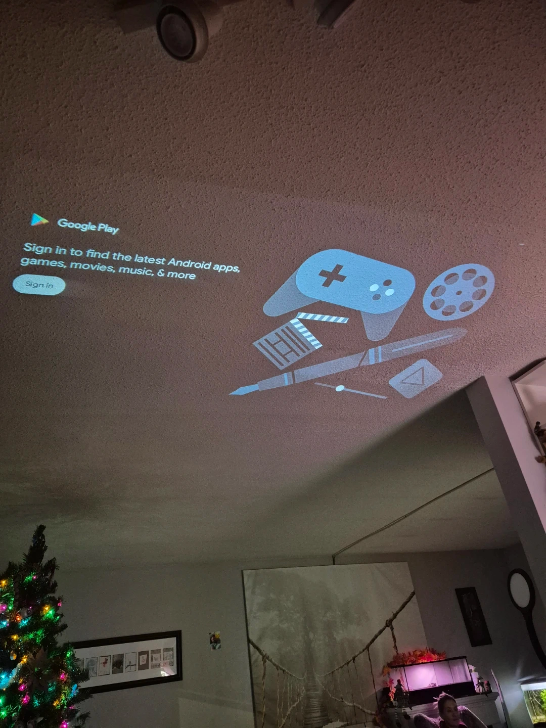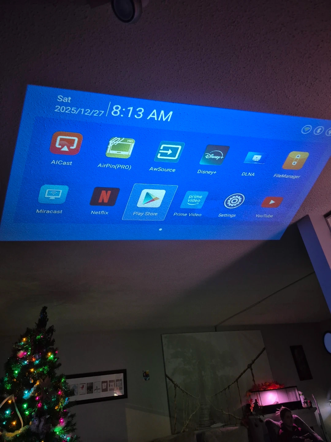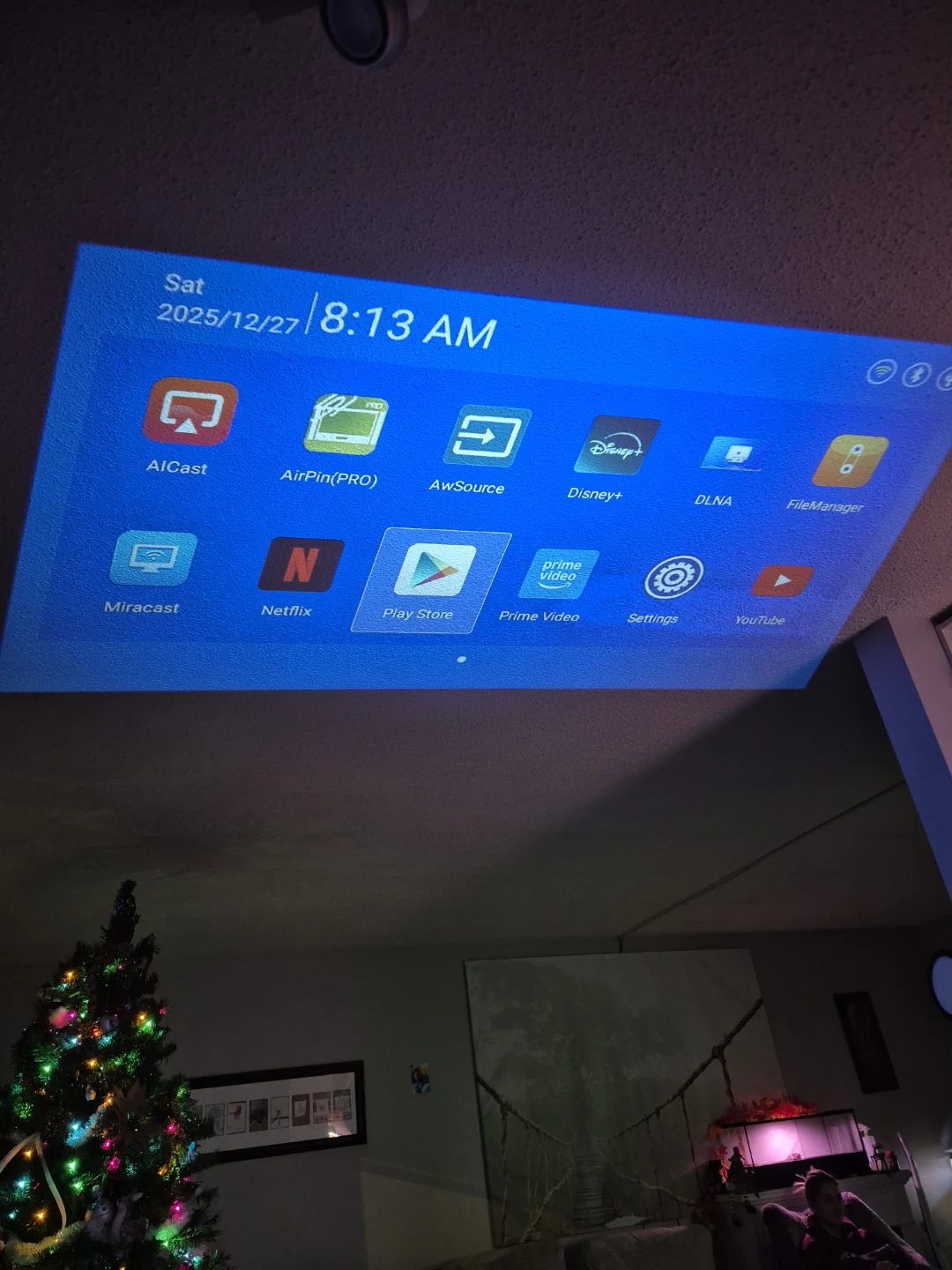 Selling an Android projector, it's in e new condition! It comes with the box and user manual. The screen displays Android apps, including Netflix, Youtube, Prime Video, and Disney+. The date displayed on the screen is Sat 2025 December 27.