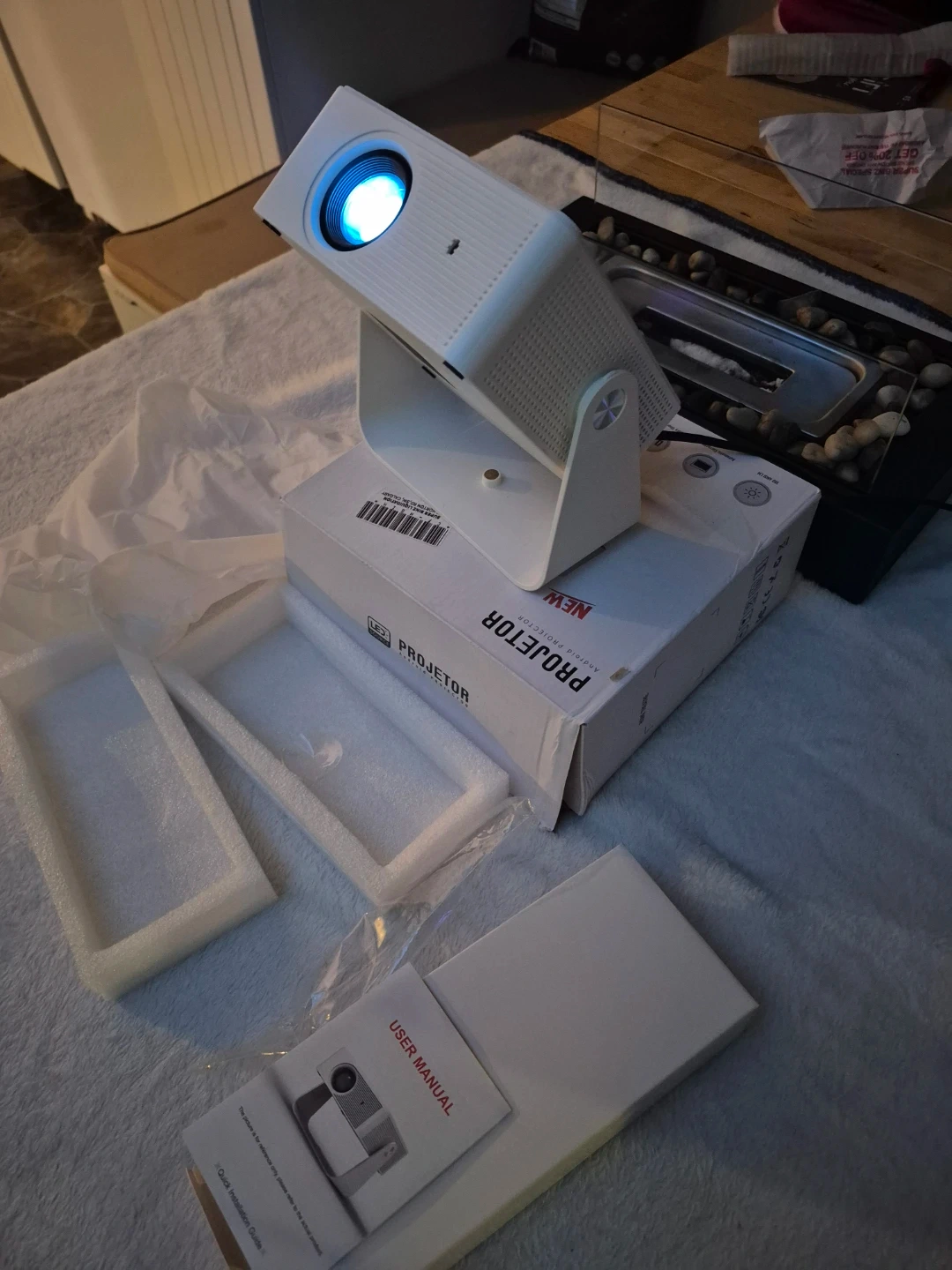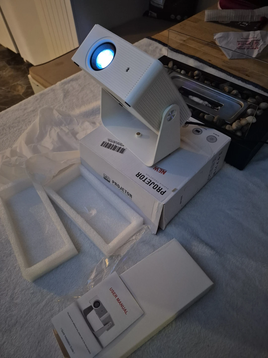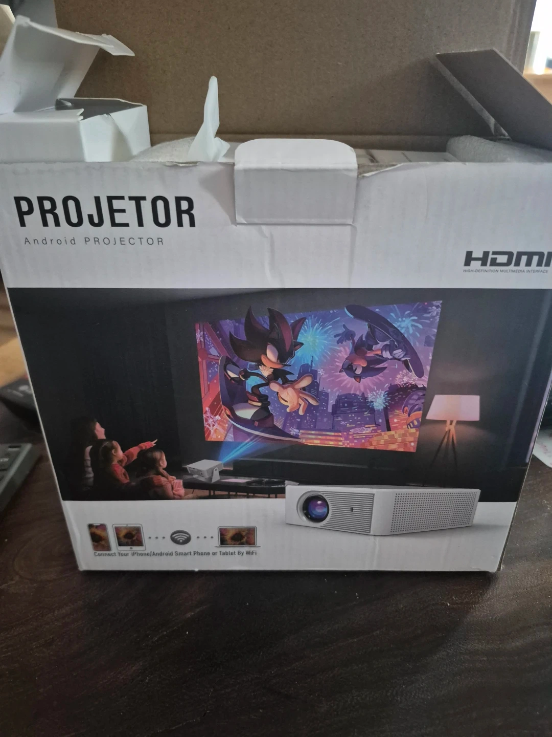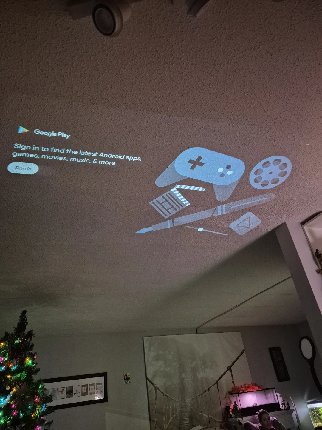 Selling an Android projector, it's in e new condition! It comes with the box and user manual. The screen displays Android apps, including Netflix, Youtube, Prime Video, and Disney+. The date displayed on the screen is Sat 2025 December 27.