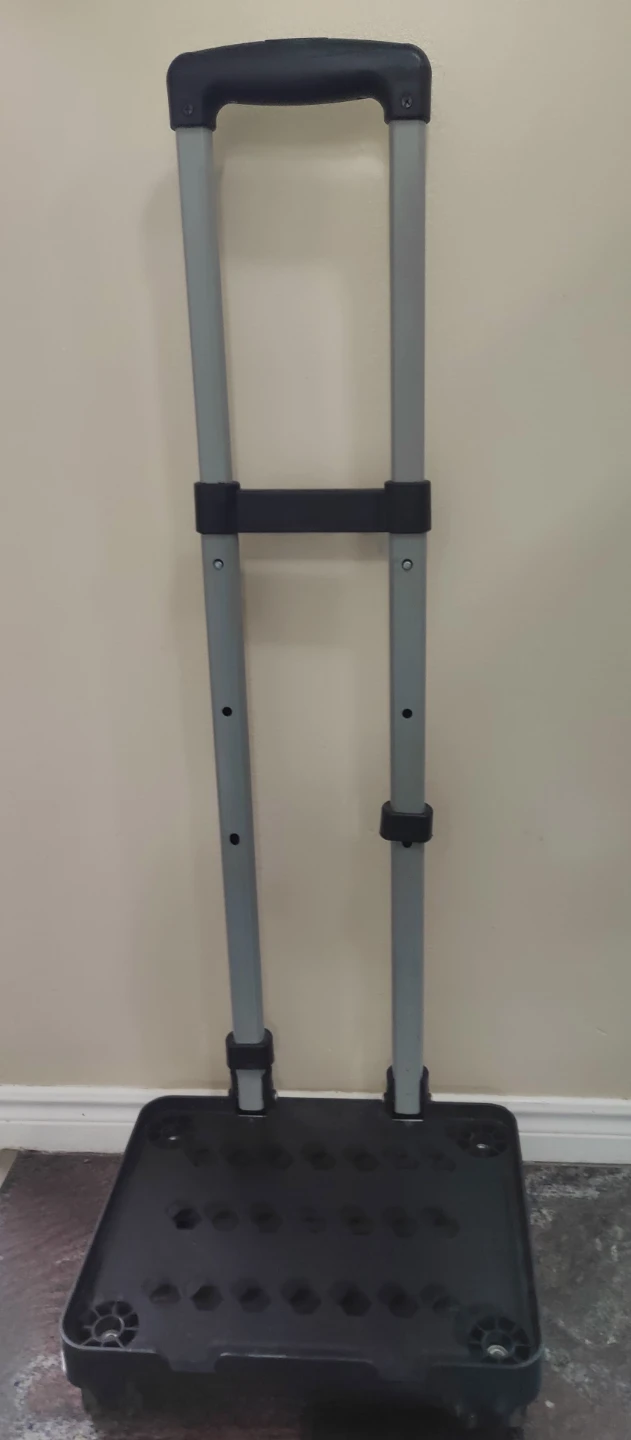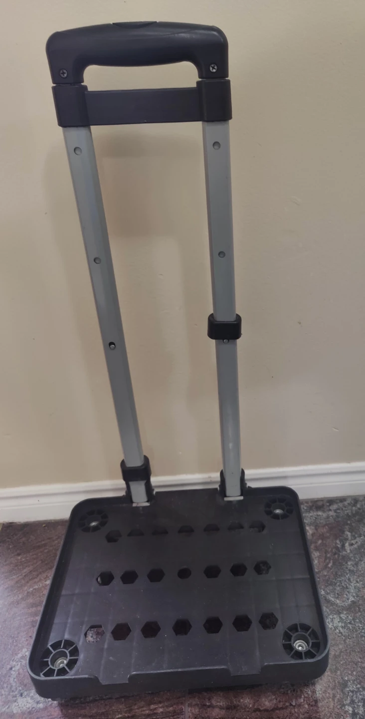 Selling a rolling luggage cart in good condition. It's perfect for easily transporting heavy items. The handle extends and retracts smoothly and the base folds towards handle making it compact. Great for travel or moving boxes!