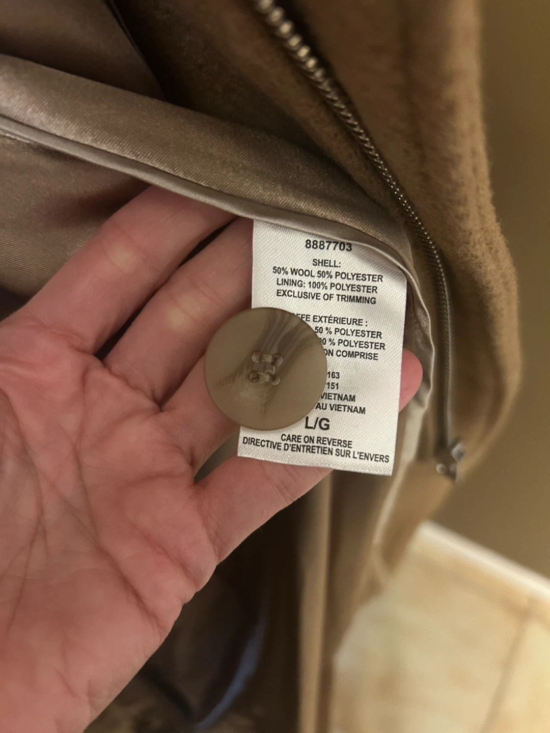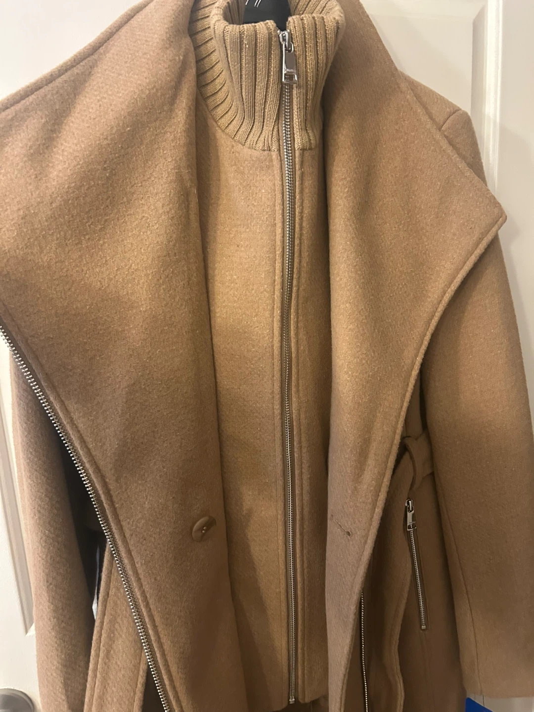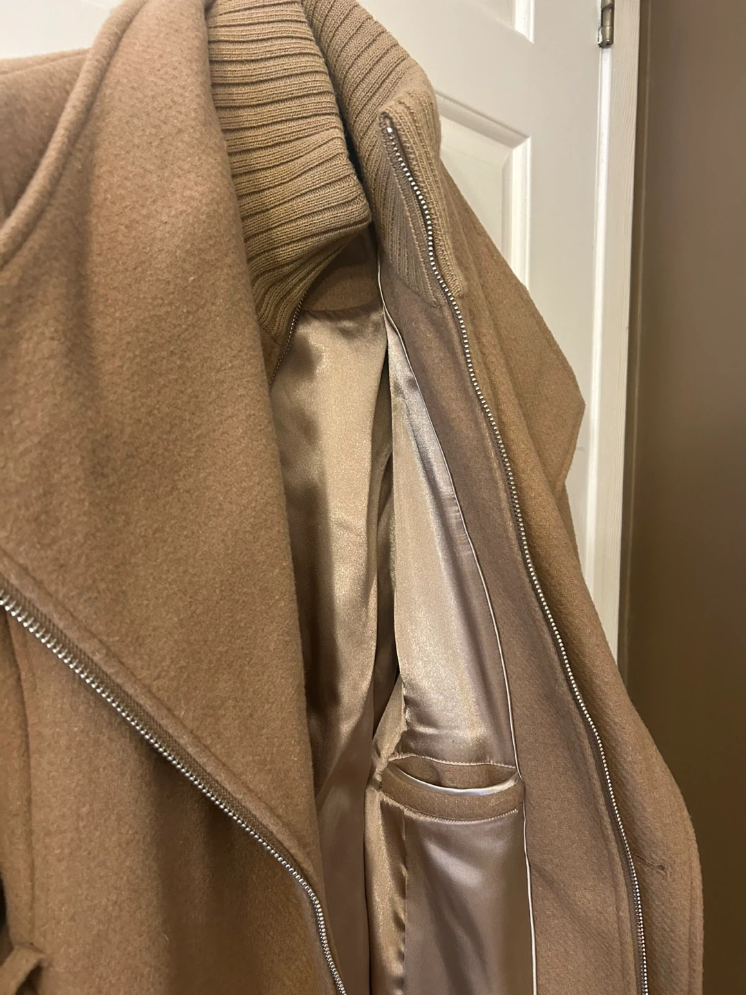 Calvin Klein wool-blend coat in camel colour! It's a size large. Can be worn numerous ways and features a stylish asymmetrical design with inner zip closure and a belted waist. Beautiful lux coat perfect for staying warm and looking great this season!