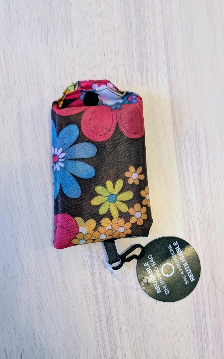 This reusable shopping bag features a fun floral pattern! It's compact and perfect for carrying groceries or other items. It also has a clip so you can attach it to your bag or keys for easy access