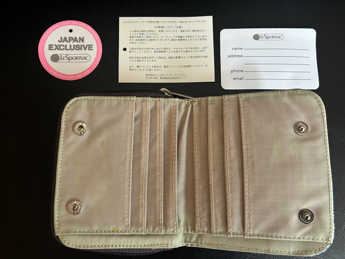 Selling a cute LeSportsac wallet, a Japan exclusive! It's in great condition and ready for a new owner. The wallet features a unique pattern and is perfect for keeping your cards and cash organized. It has a zippered closure to keep everything secure.