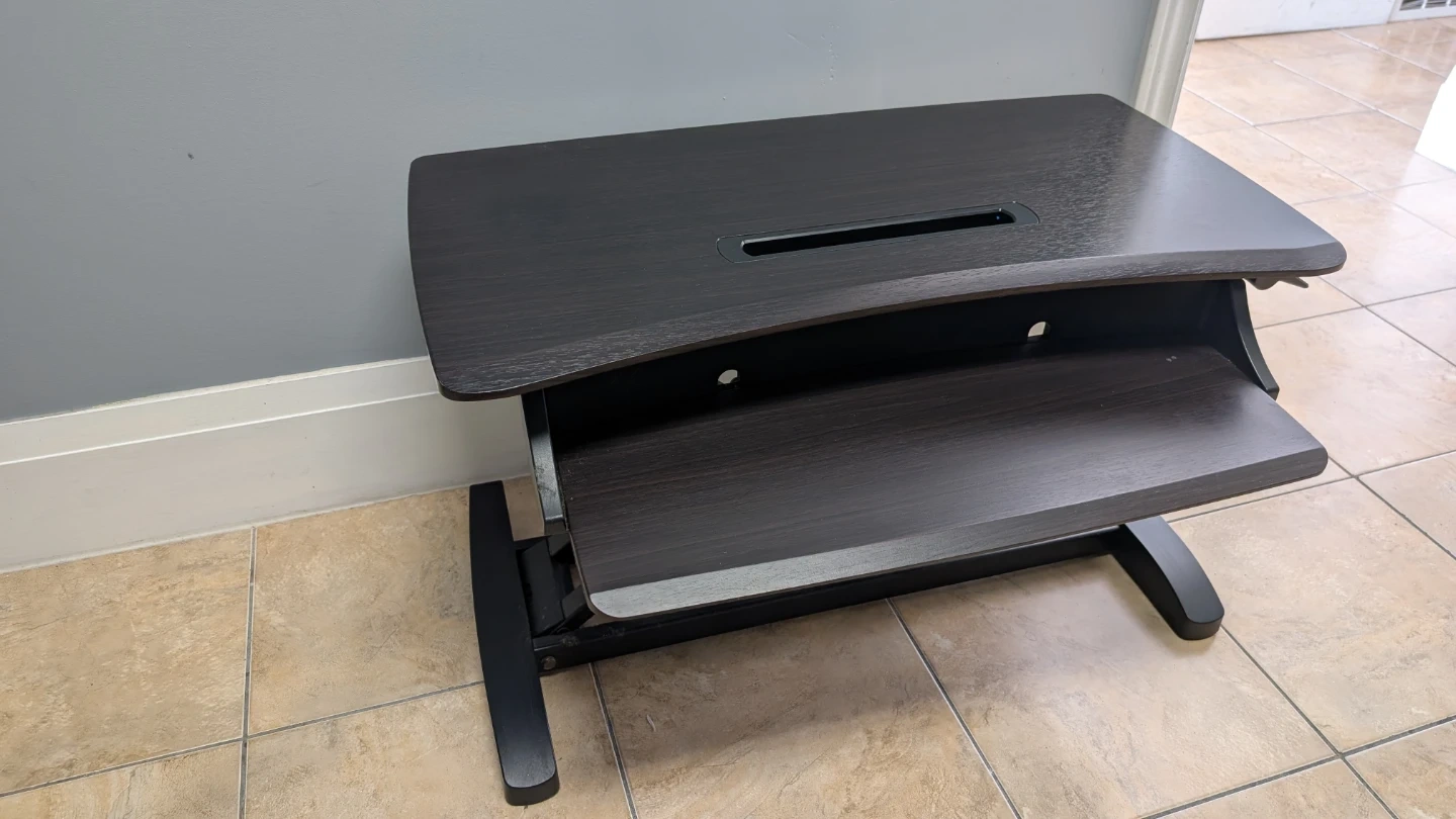 Selling a black adjustable monitor stand! In great condition and would be perfect for a home office setup. It has a sliding tray and is adjustable, so you can get the perfect height for your monitor and keyboard.