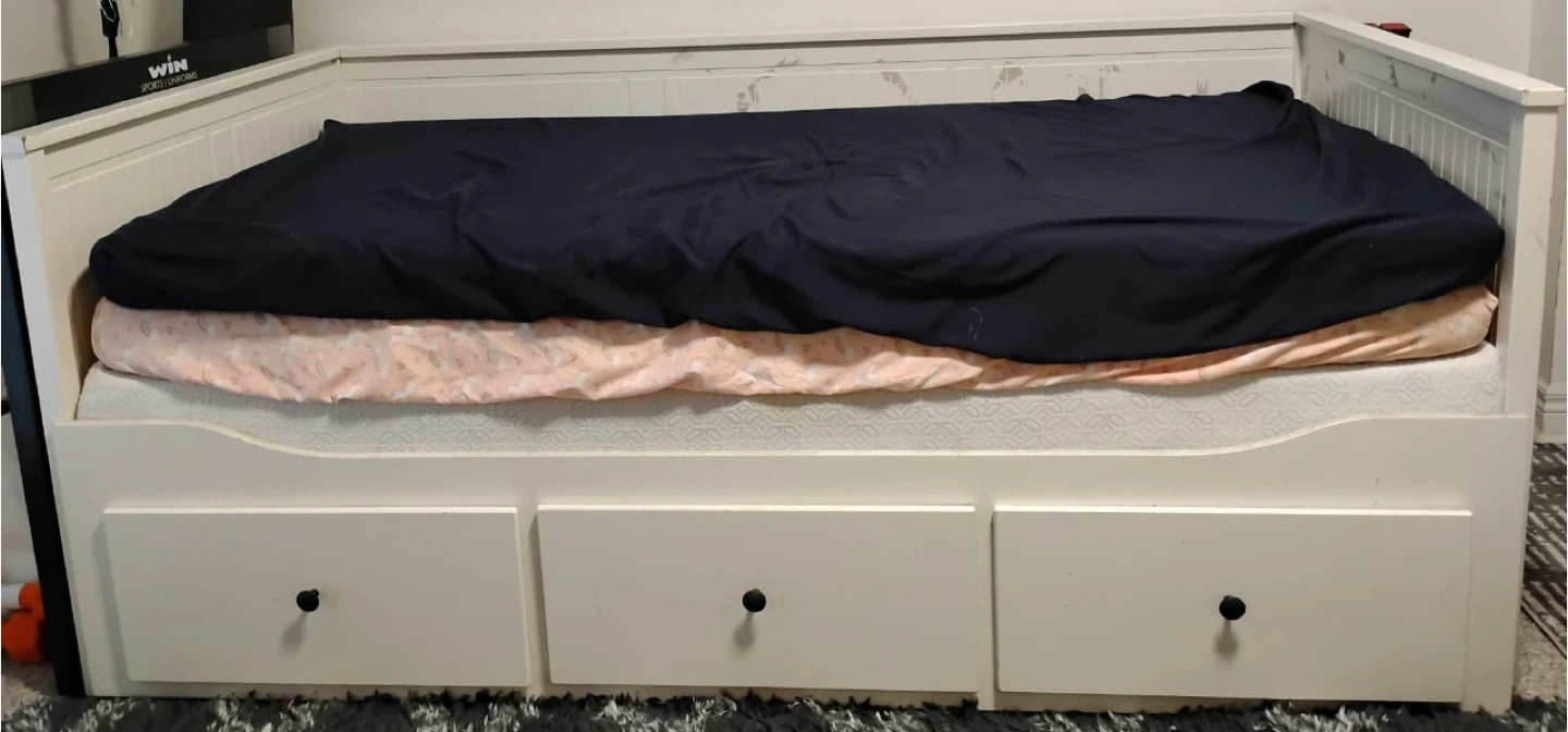 Selling a white daybed that's in good condition. It features three drawers underneath for extra storage, perfect for a kid's room or a guest room. Two mattresses can be purchased additionally