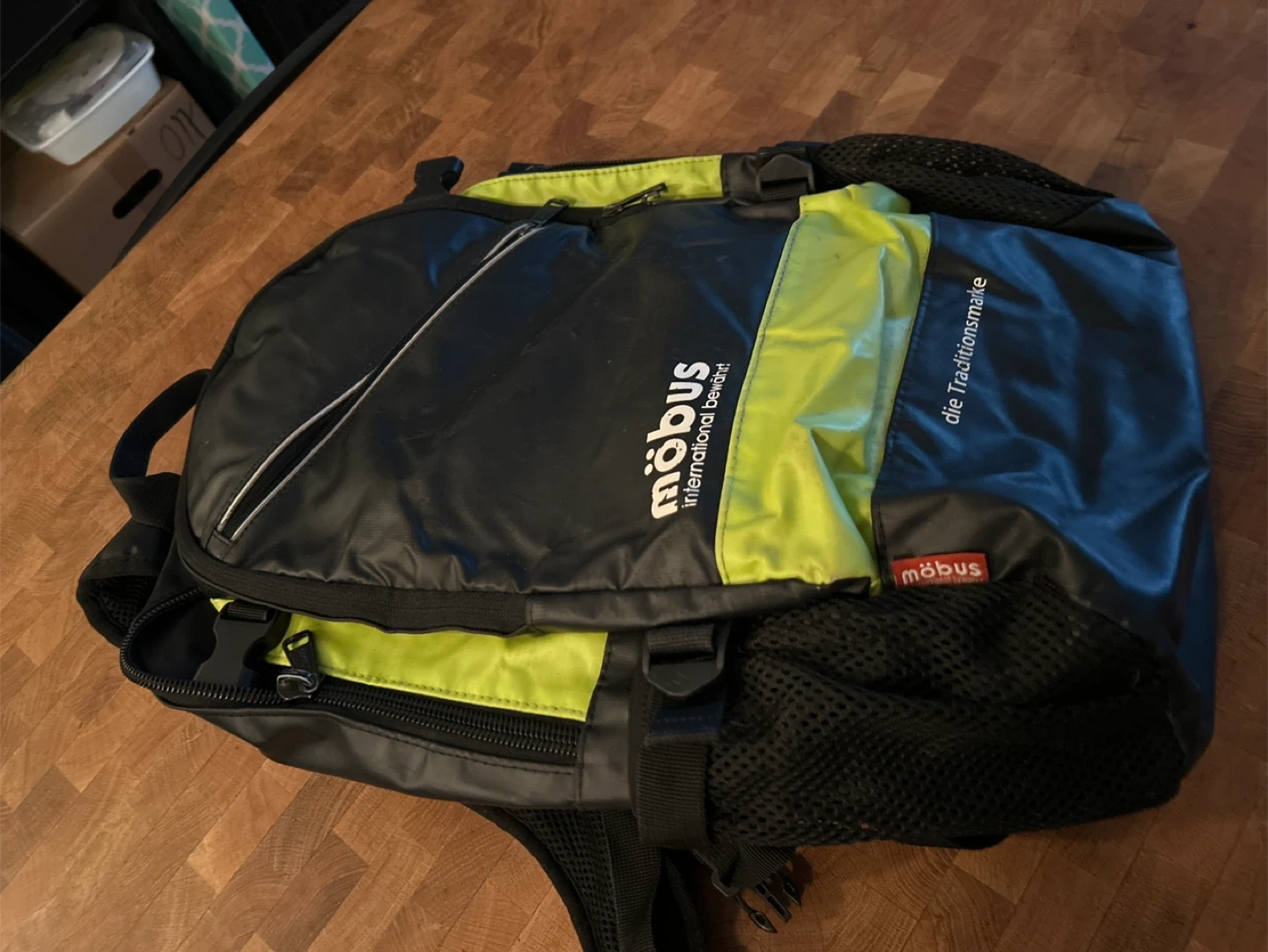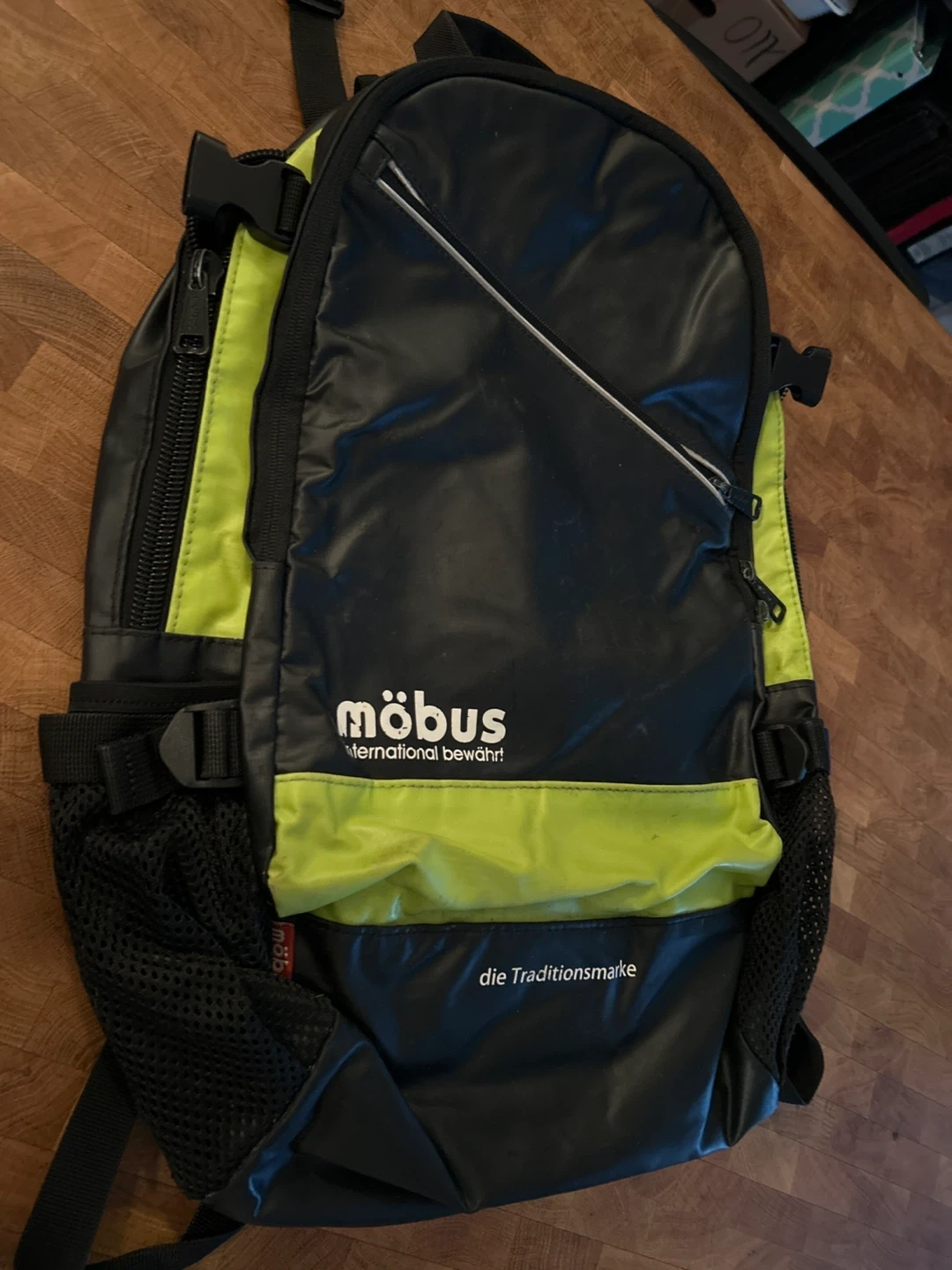 Selling a Möbus backpack in black with green accents. It's in great shape and ready for your next adventure! The brand logo is prominently displayed, and it features a sleek design. Perfect for school, work, or travel