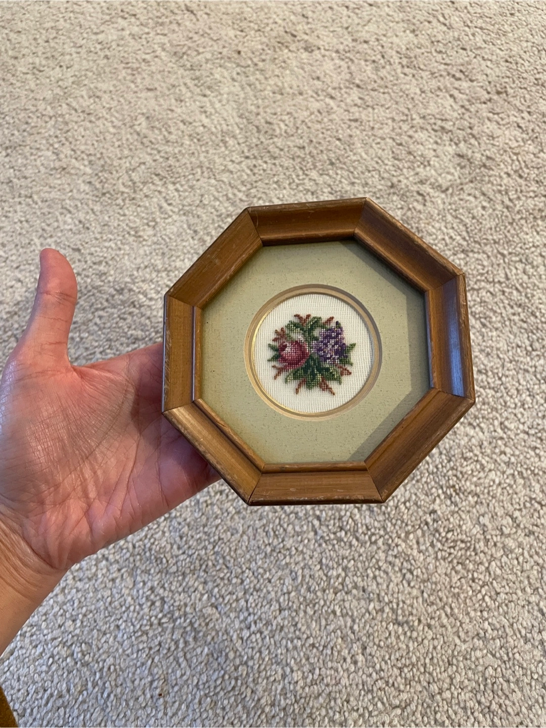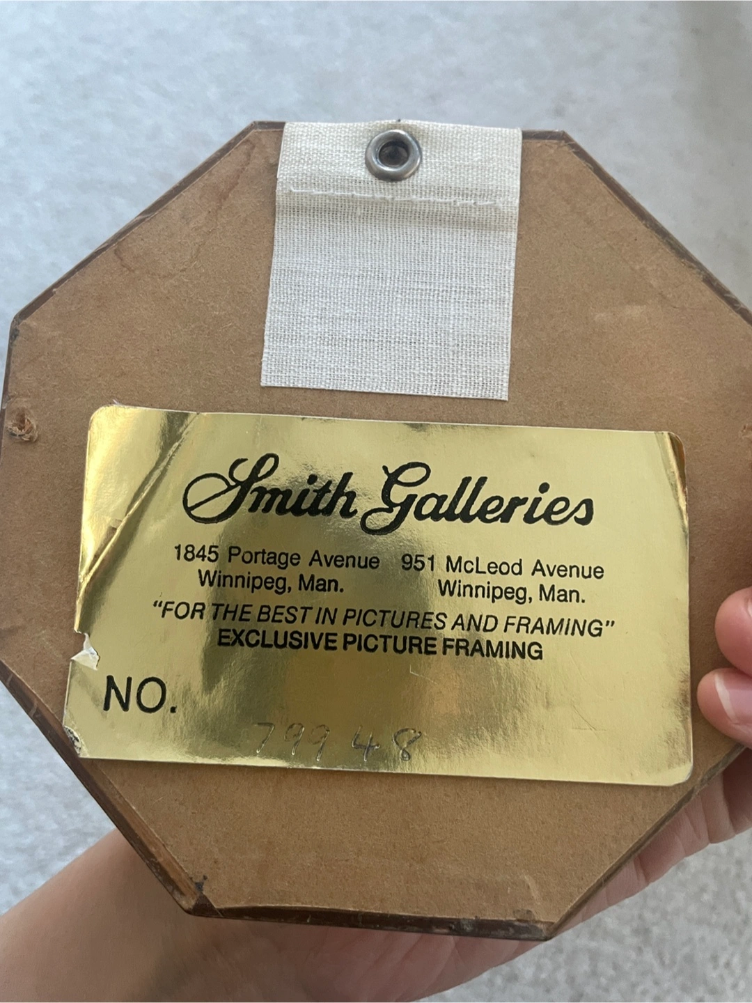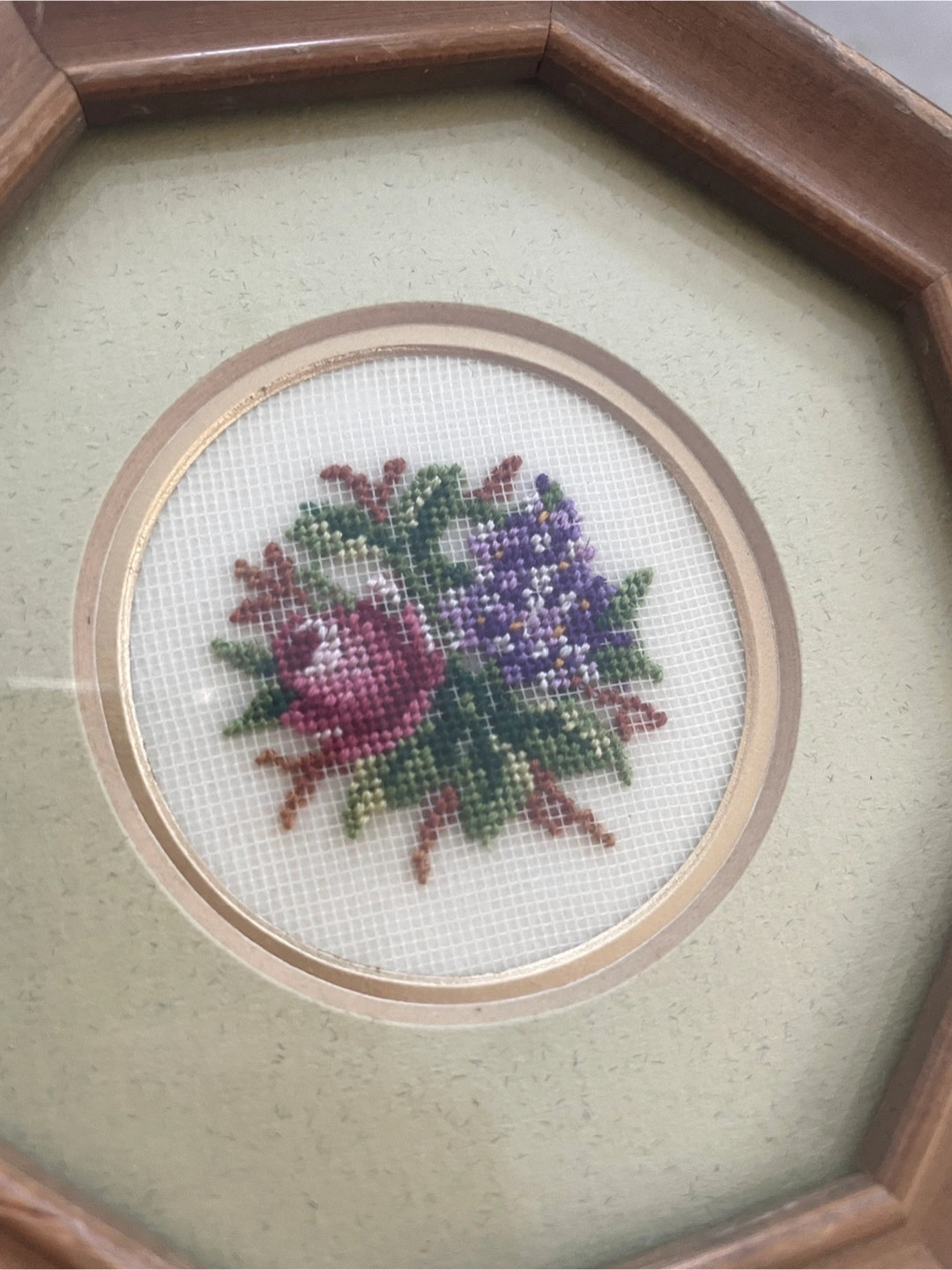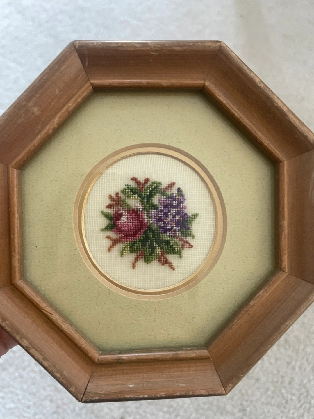 A cute framed needlepoint from Smith Galleries in Winnipeg. The frame is octagonal and made of wood. Perfect for adding a touch of vintage charm to your home!