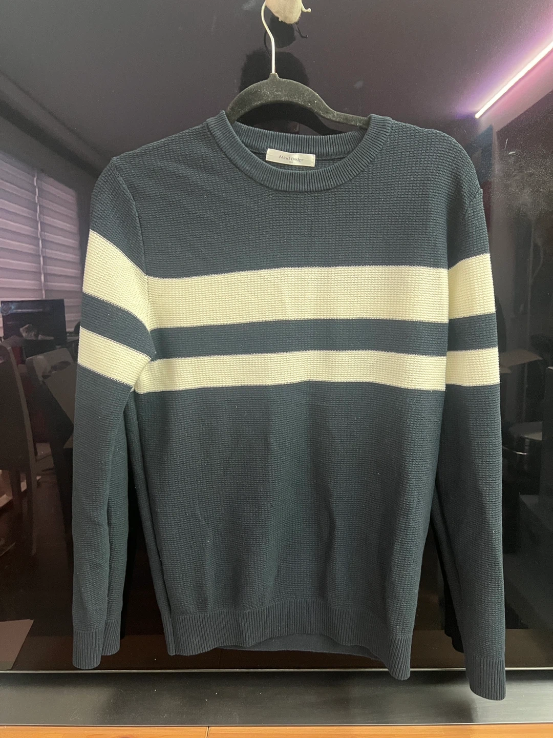 Here's a Mind Bridge crewneck sweater with a stylish striped design! It's in great shape and ready for a new home. Perfect for adding a touch of casual cool to your wardrobe