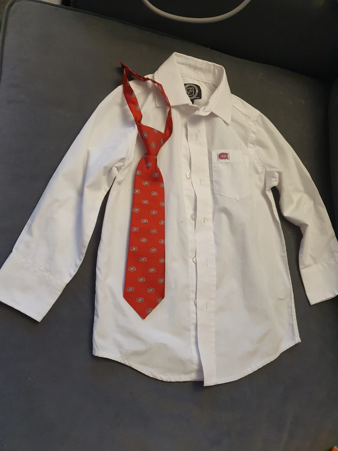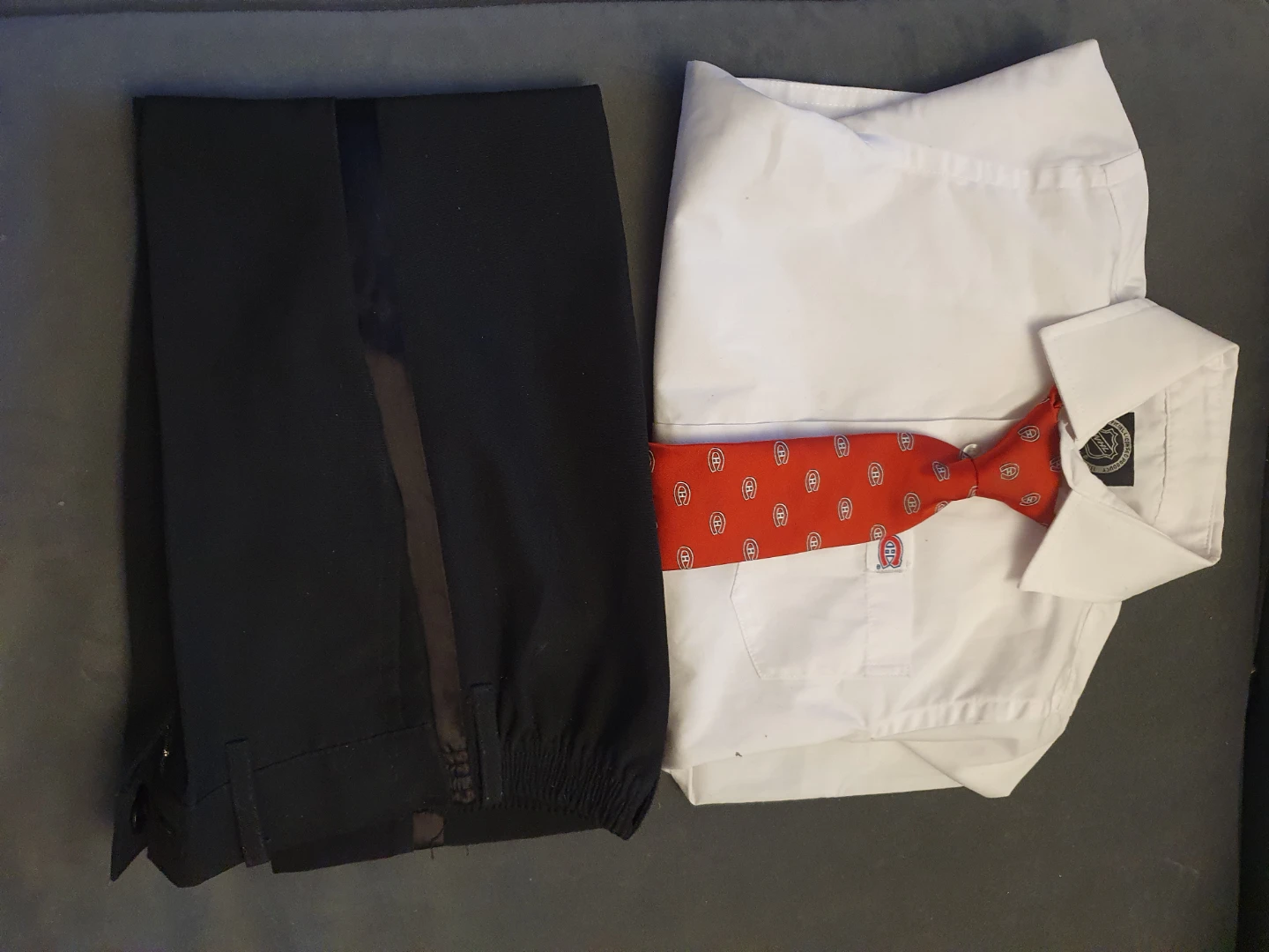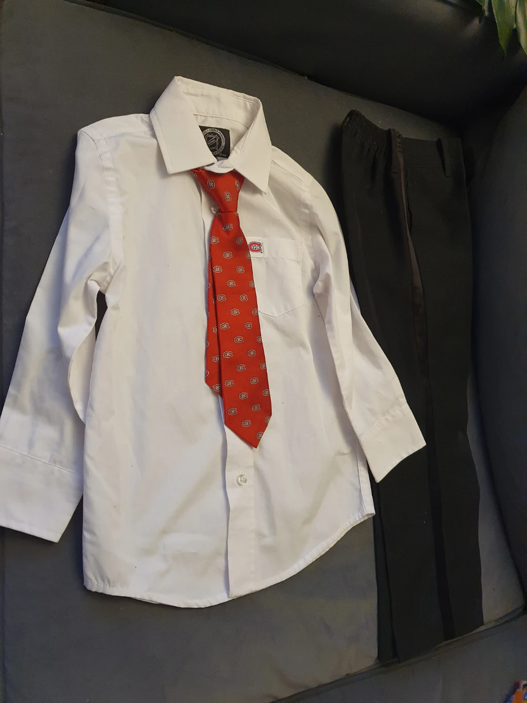 Selling a gently used boy's formal outfit. It includes a white button-down shirt, black dress pants, and a red patterned tie. Perfect for special occasions! 4 years old. Shirt and tie never used.