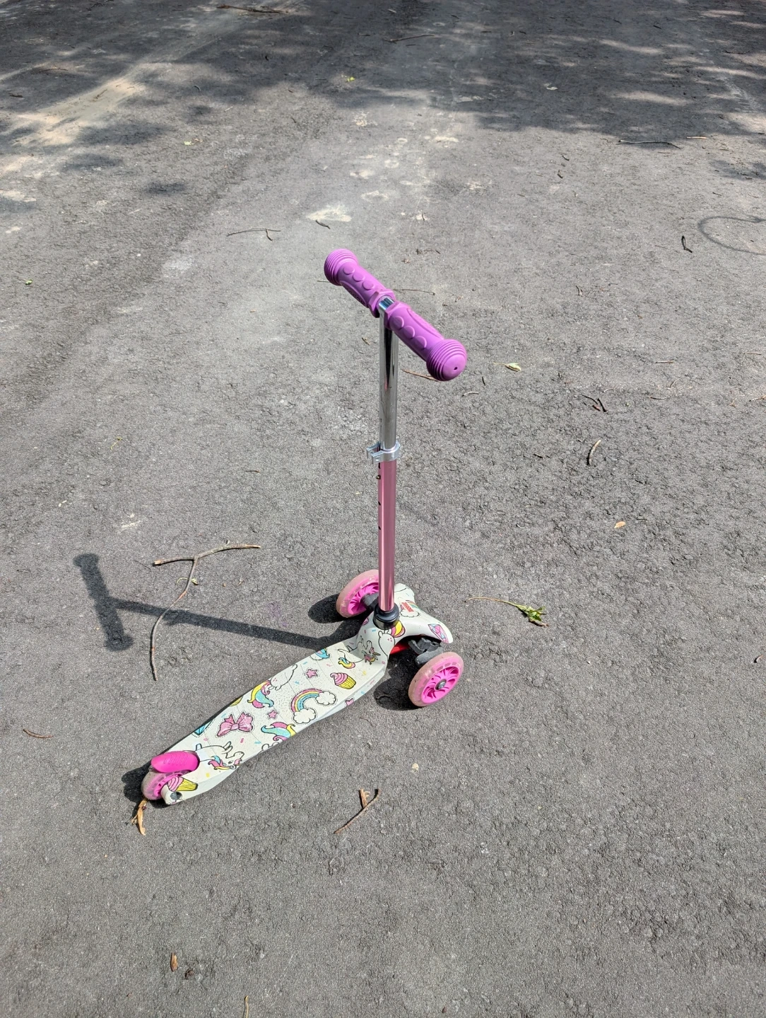 Selling a cute 3-wheel scooter for kids! It features a fun unicorn and rainbow design on the deck and pink wheels and handlebars. Great for learning balance and coordination. Wheels light up