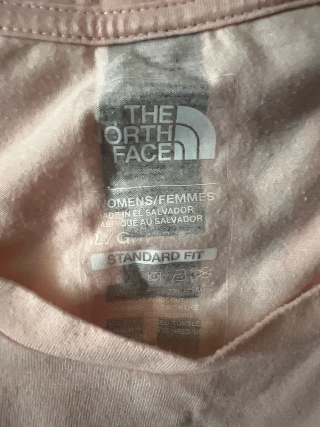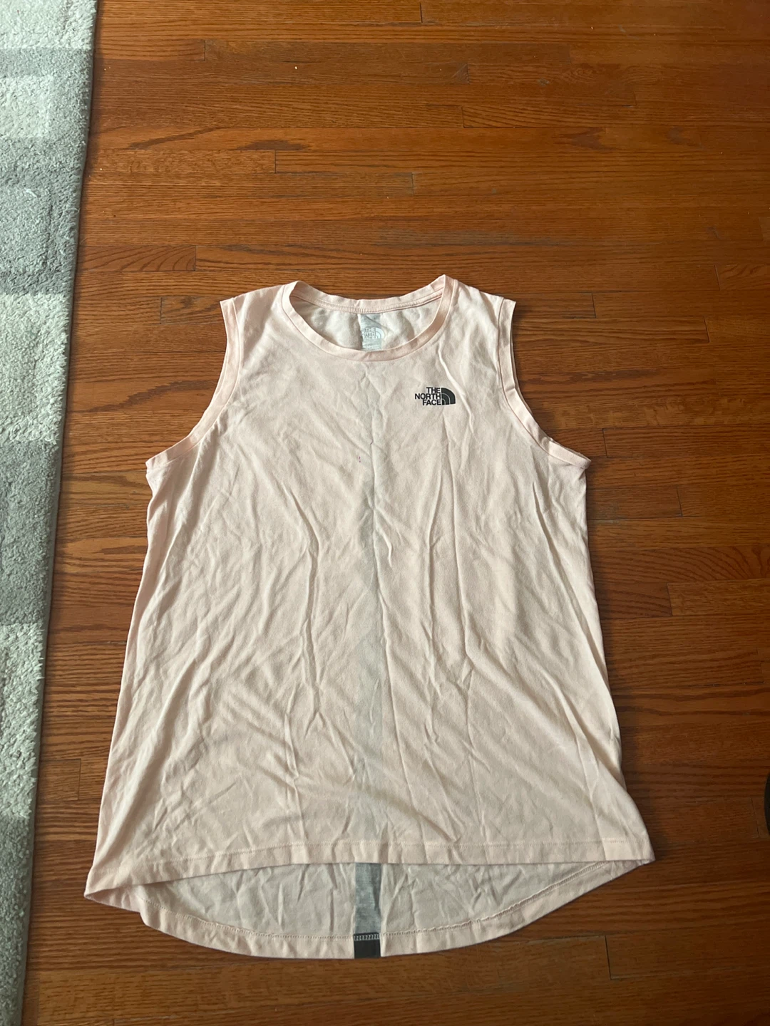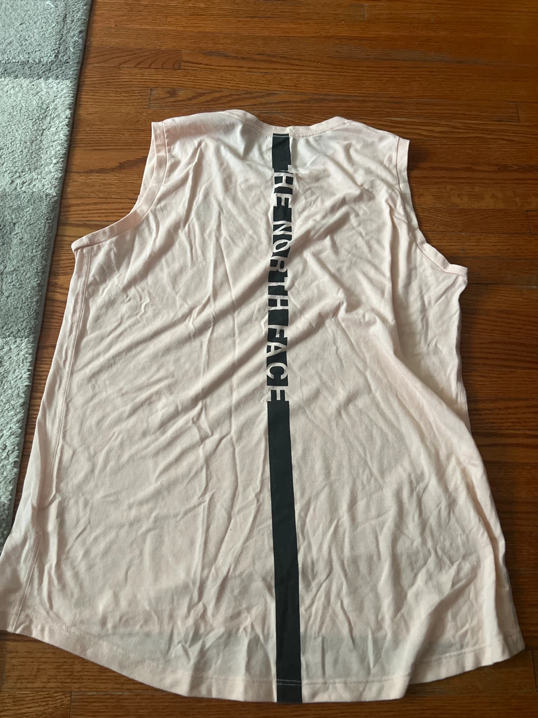 Selling a women's tank top from The North Face in size large. It's a light pink colour and made of 63% cotton and 37% rayon. The back has a black stripe with the brand name.