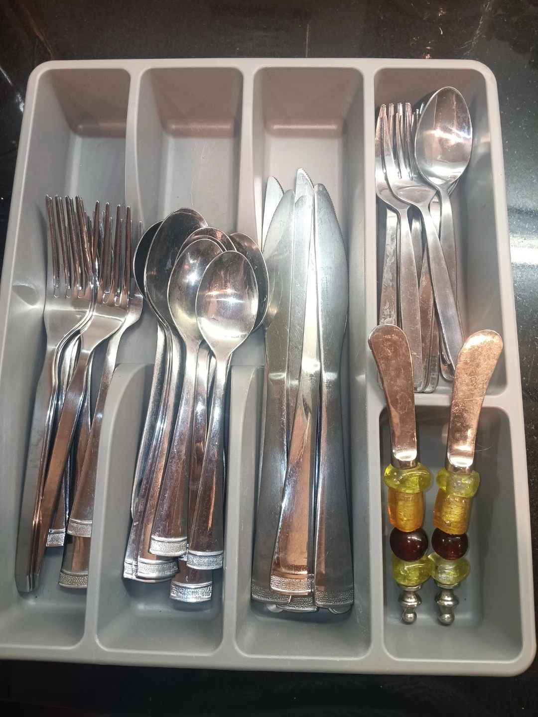 Selling a used silverware set (45 Pieces) with a variety of forks, spoons, and knives. The set includes 2 butter knives with decorative beaded handles. Perfect for everyday use!