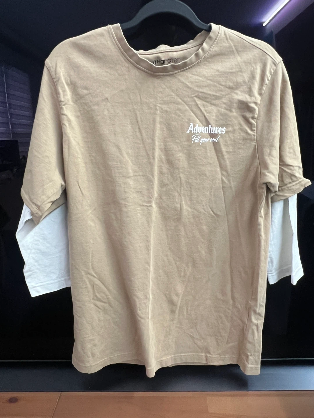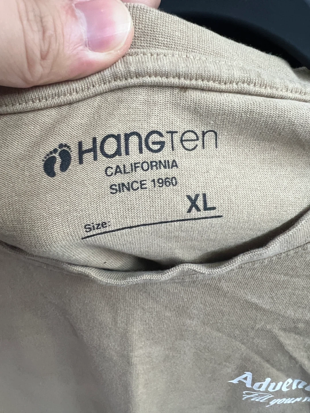 Selling a Hang Ten California t-shirt in size XL. It's a tan colour with 'Adventures fill your soul' written on the chest. Perfect for casual wear!