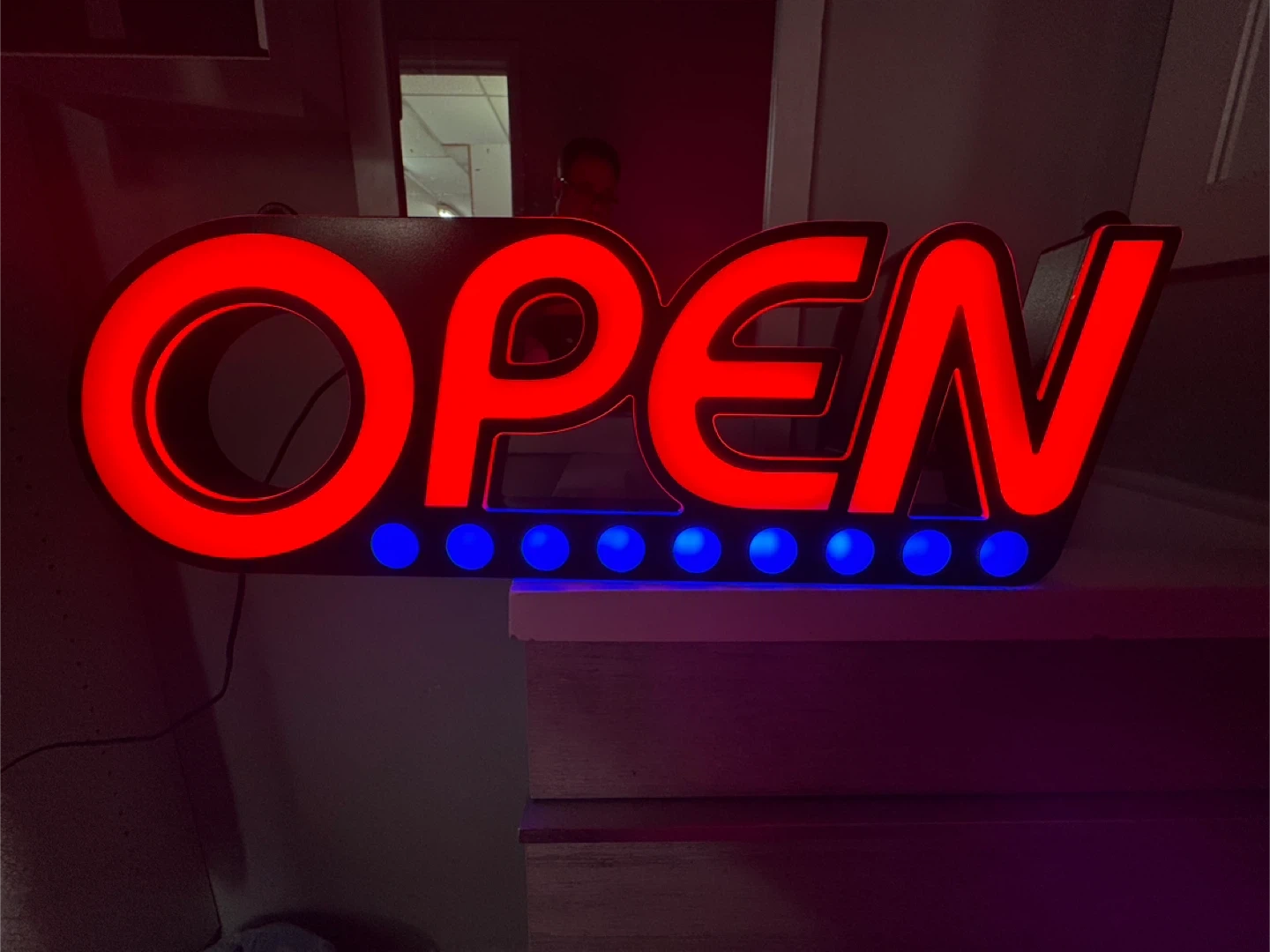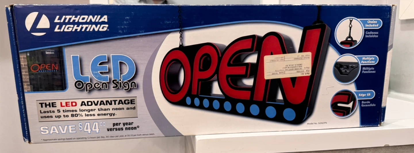 I'm selling a Lithonia Lighting LED Open Sign. It lasts 5 times longer than neon and uses up to 80% less energy. The box is included. Chains are included for hanging and it has multiple functions.