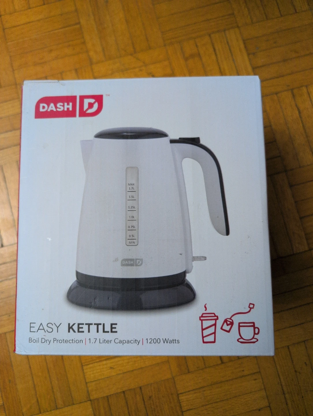 Selling a Dash Easy Kettle with a 1.7 liter capacity. It features boil dry protection and has a 1200 Watts power rating. Comes in the original box!