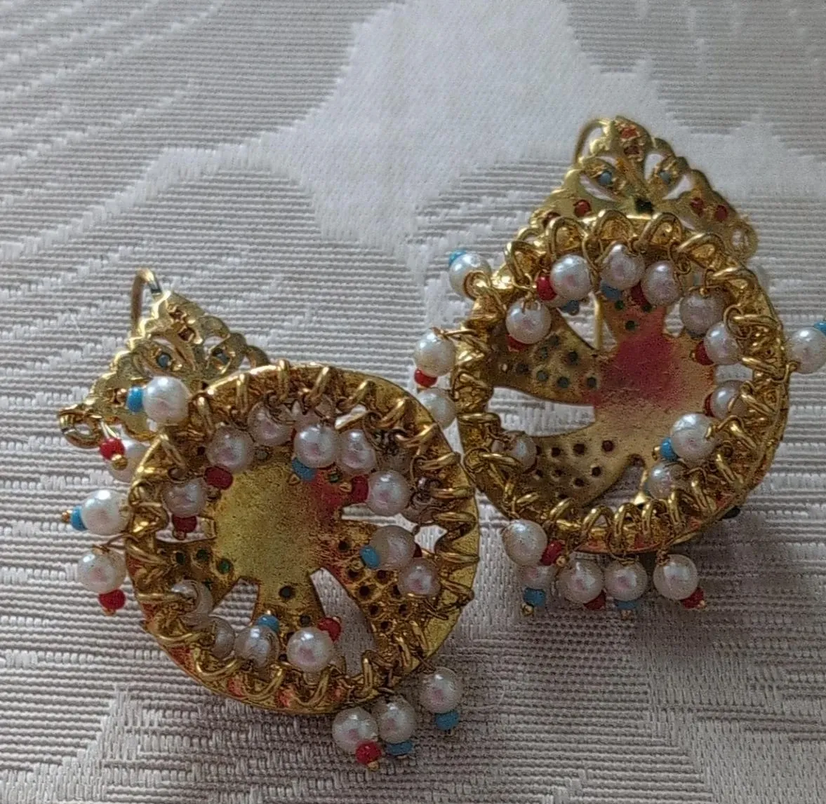 These are a pair of gold-tone earrings with pearl accents. They have a unique design with small red and blue beads adding a pop of colour. They're in great condition and ready to add a touch of elegance to any outfit!