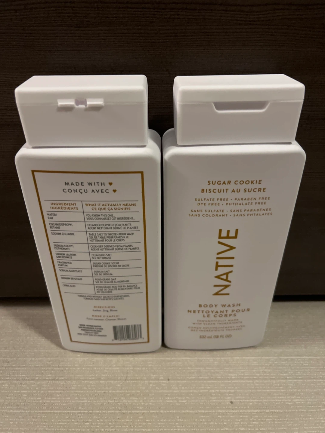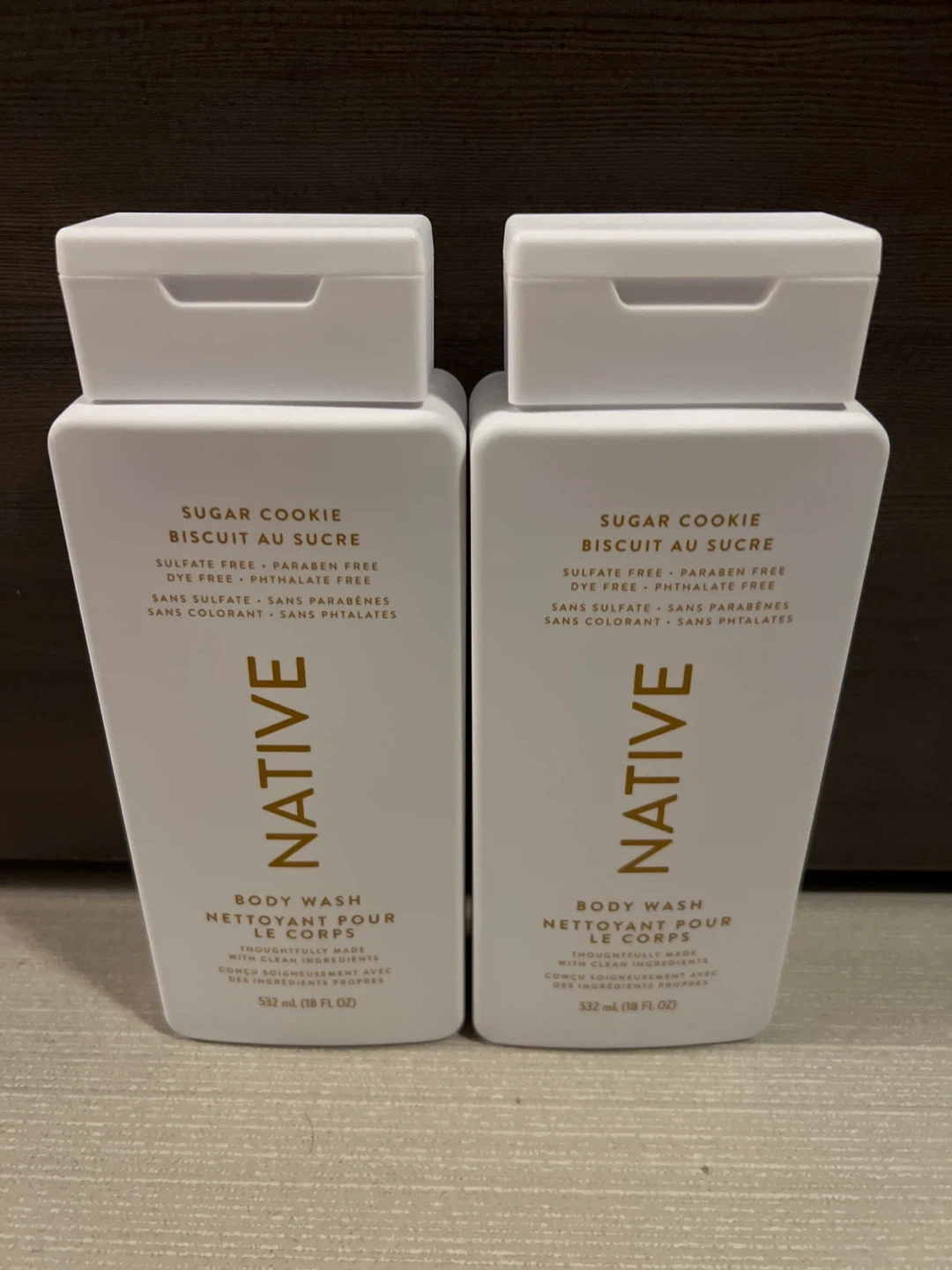 Selling two bottles of Native Body Wash in the Sugar Cookie scent! Each bottle contains 532 mL (18 fl oz). They are sulfate-free, paraben-free, dye-free, and phthalate-free. Perfect for sensitive skin and a sweet treat for your shower routine