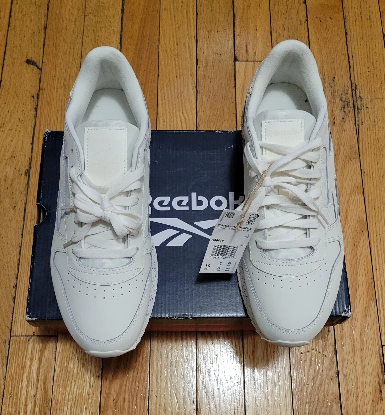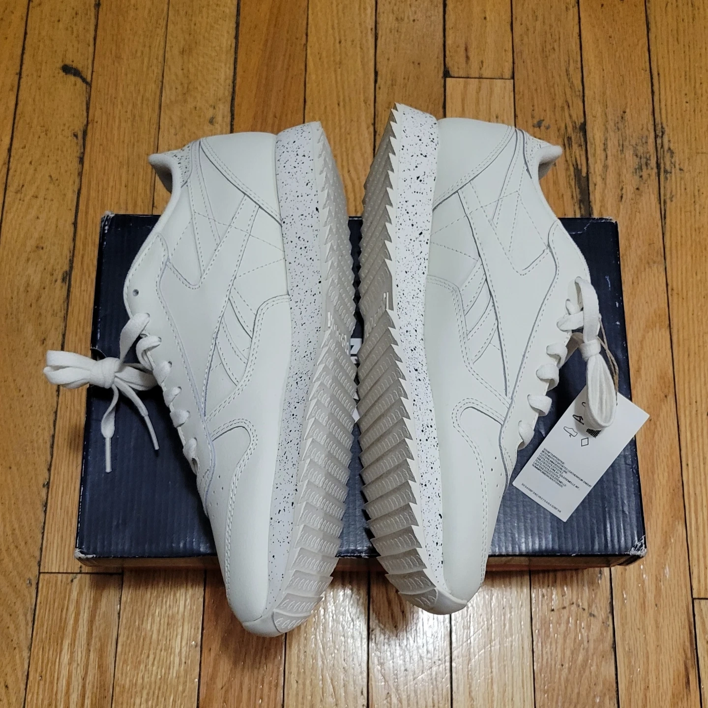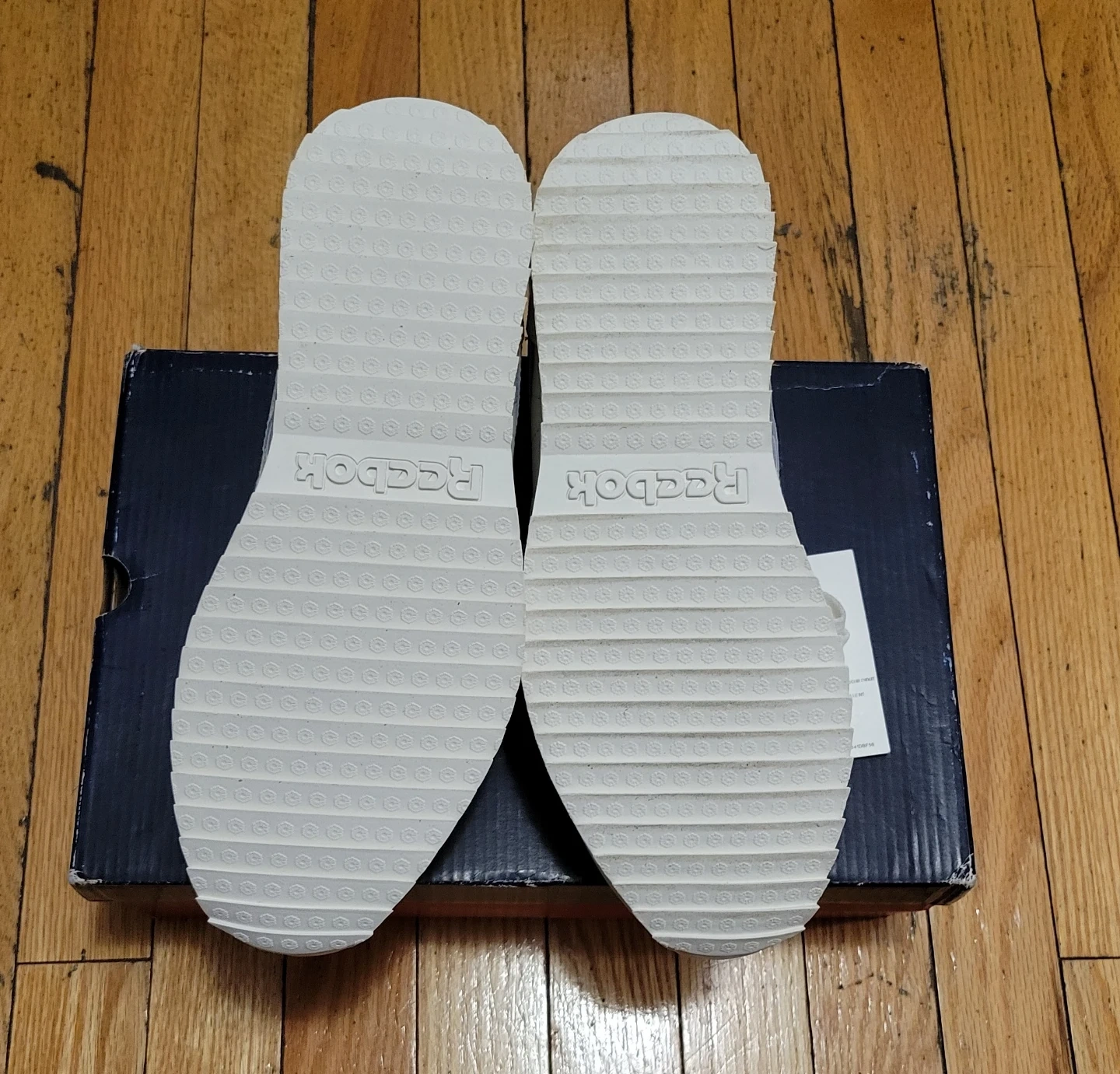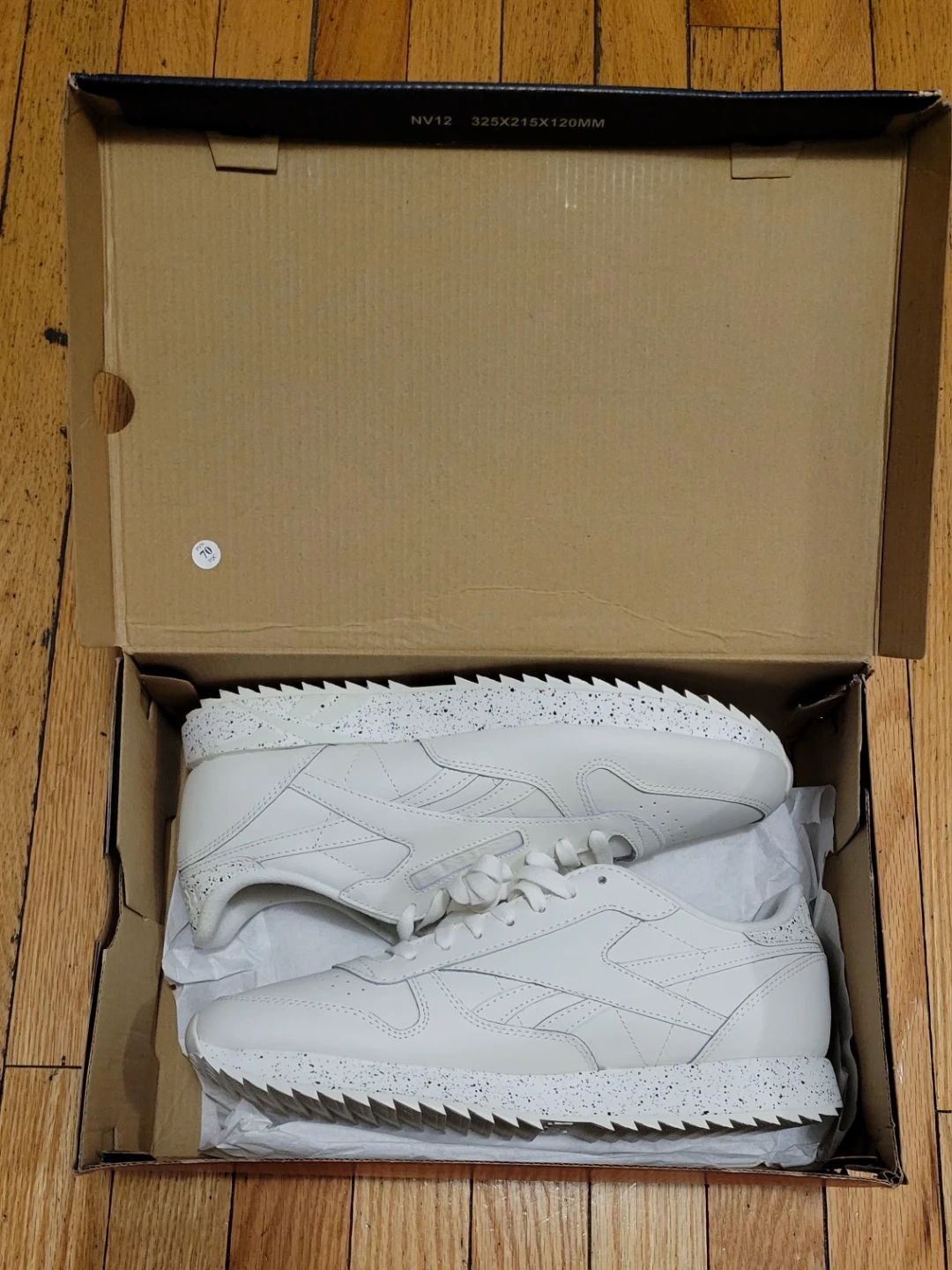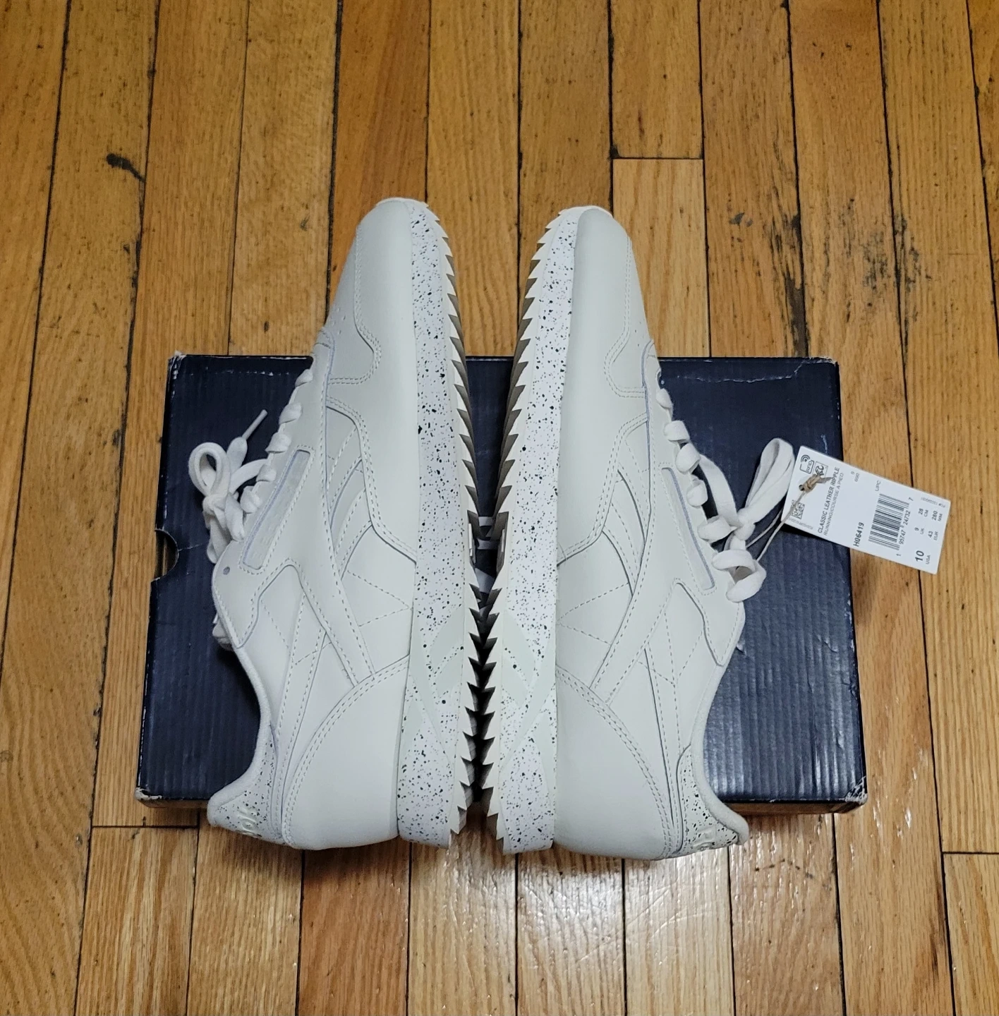 Selling a pair of Reebok Classic Leather Ripple shoes in US size 10! They come with the original box. These stylish sneakers are perfect for everyday wear and have a unique ripple sole design. They are in new condition.