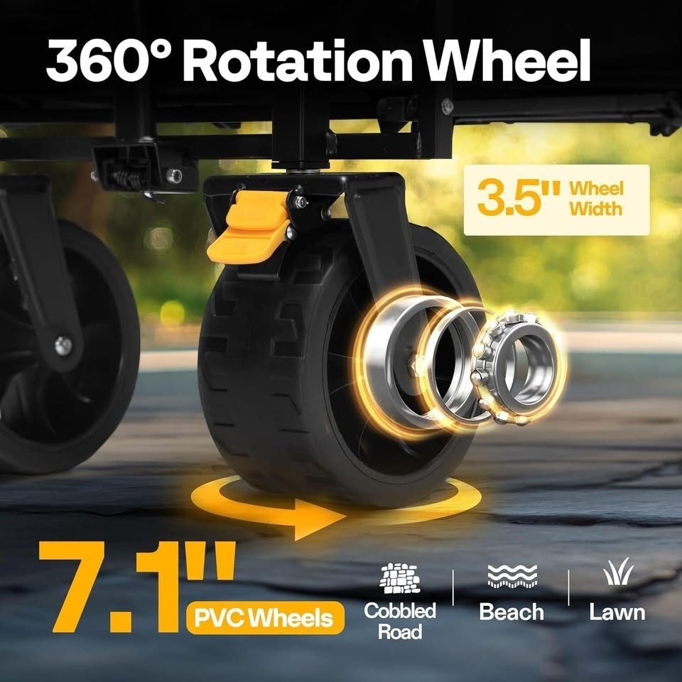 This collapsible wagon features four 6.5-inch PVC all-terrain wheels built to handle hard sand, grass, and all kinds of complex ground. The rear wheels are equipped with two brakes, providing stability when parked on slopes. This cart will become your assistant in trivial garden work, helping you haul various flowers, fertilizers, and gardening supplies with ease.